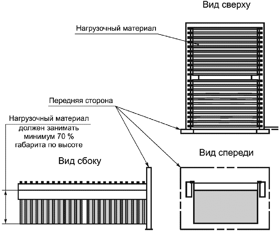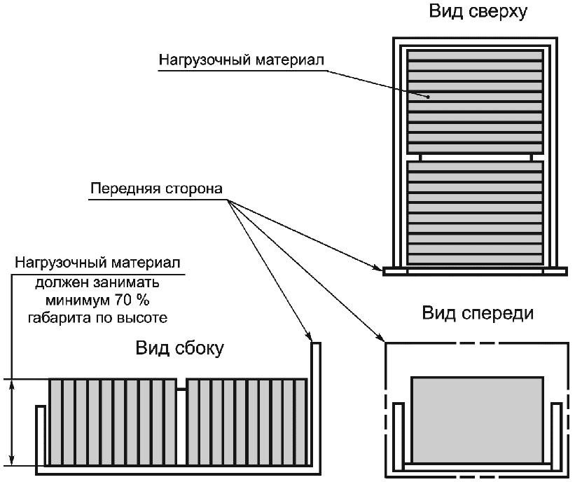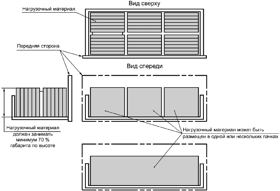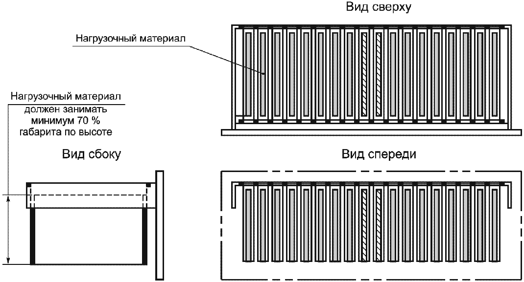Нагрузочный материал должен быть равномерно распределен от передней стороны к задней, а также от одной стороны к другой на дне ящика. В качестве нагрузочных материалов могут также использоваться жесткие материалы (например, сталь, пенополистирол и т.д.). Для ящиков, у которых глубина больше ширины (см. рисунок 8), для ящиков, у которых ширина больше глубины (см.