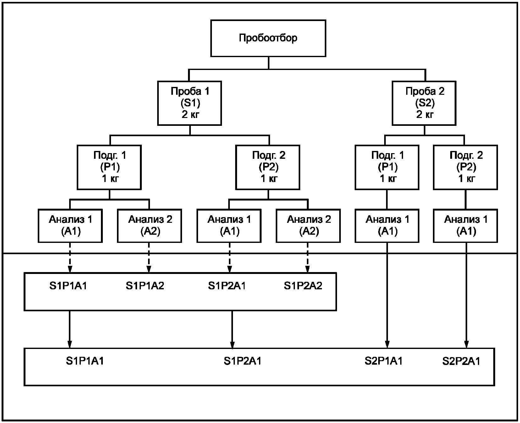 Применяемый план пробоотбора ЯМ определяет, что от каждого объекта пробоотбора (от каждой партии смешивания) отбирают одну случайную пробу S1 и выполняют однократную процедуру анализа по методике измерений.