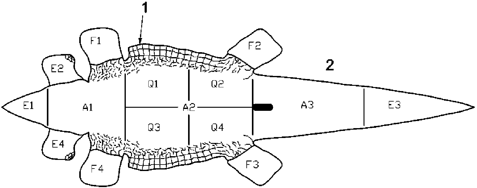 2) брюхо A2 с квадрантами брюха от Q1 до Q4;