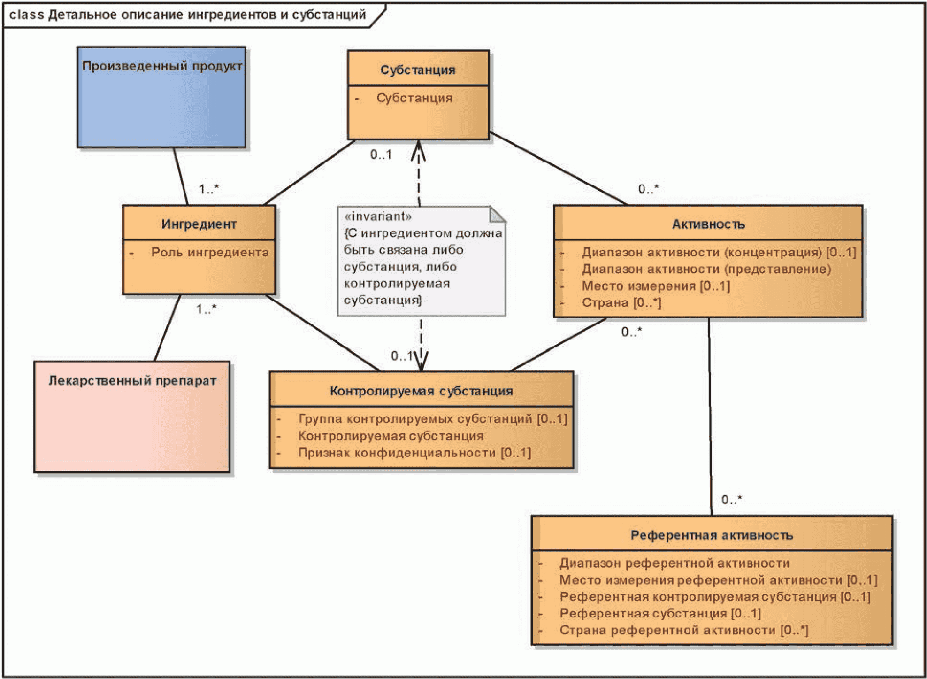 На приведенной ниже диаграмме показаны сущности описания произведенного продукта/лекарственного препарата. С помощью атрибута "Тип продукта СКТ", значения которого берутся из нормативного словаря, проводится различие между произведенным продуктом и лекарственным препаратом. На диаграмме также указана информация, описывающая активность и ингредиенты произведенного продукта/лекарственного препарата.