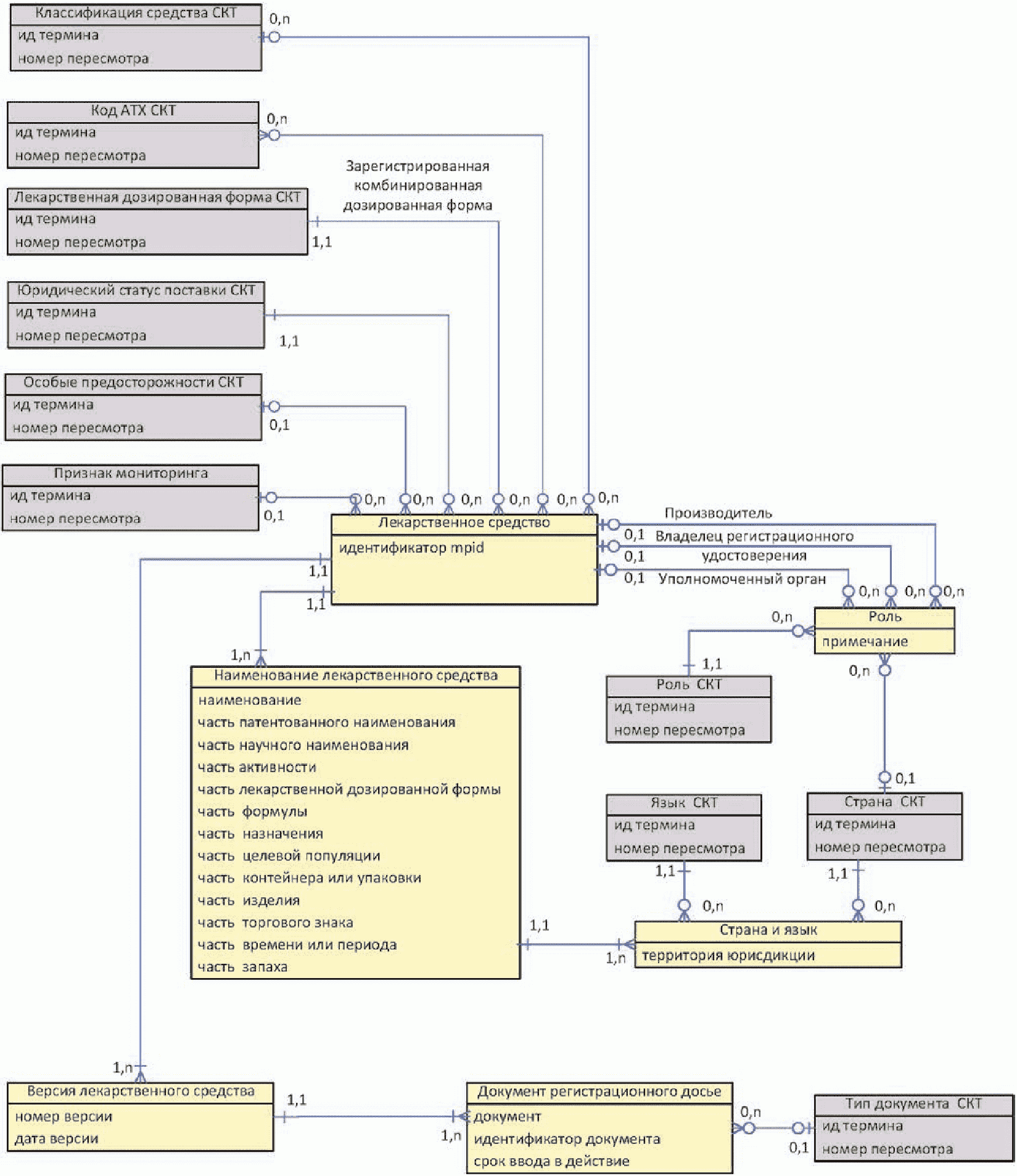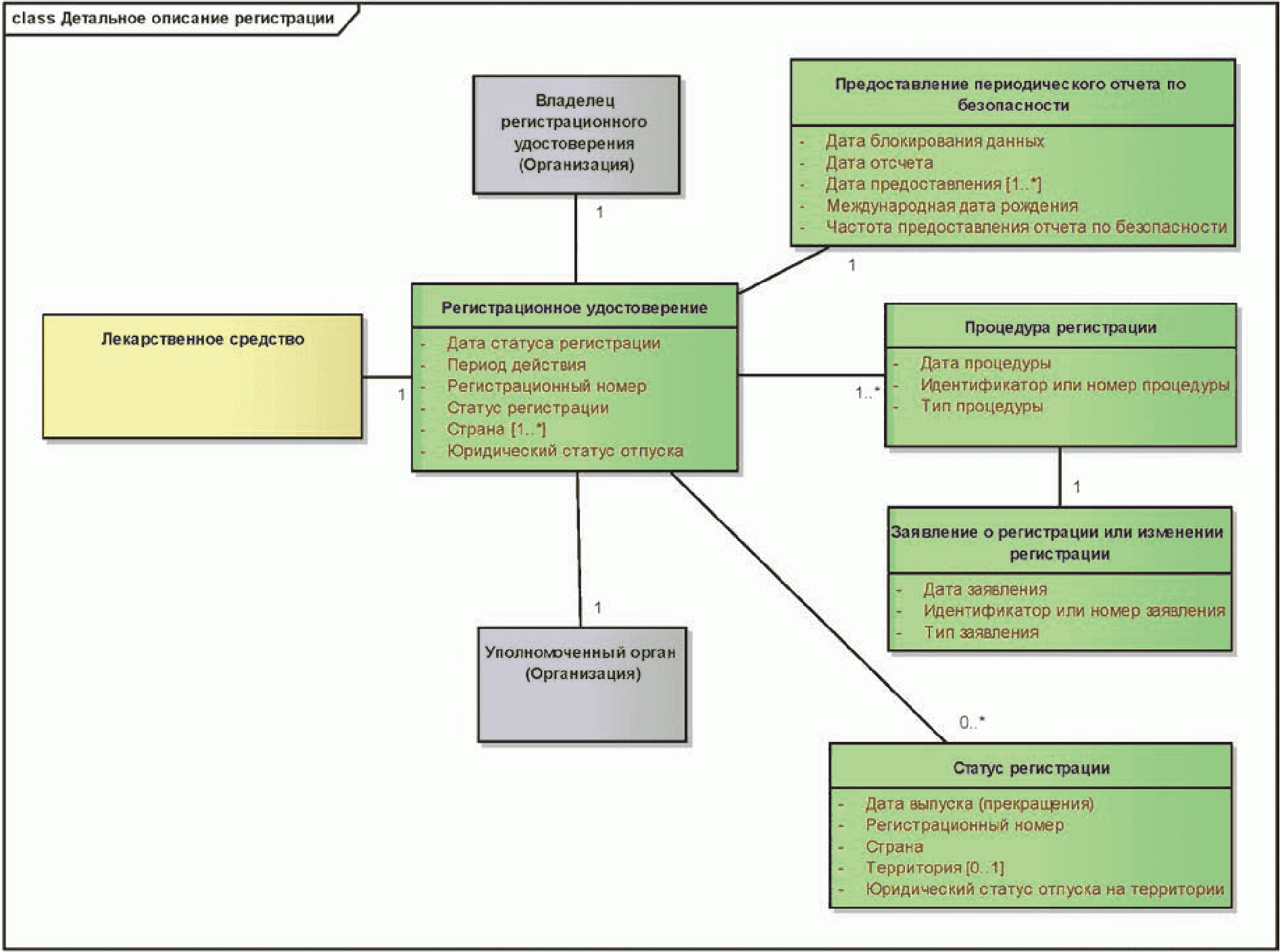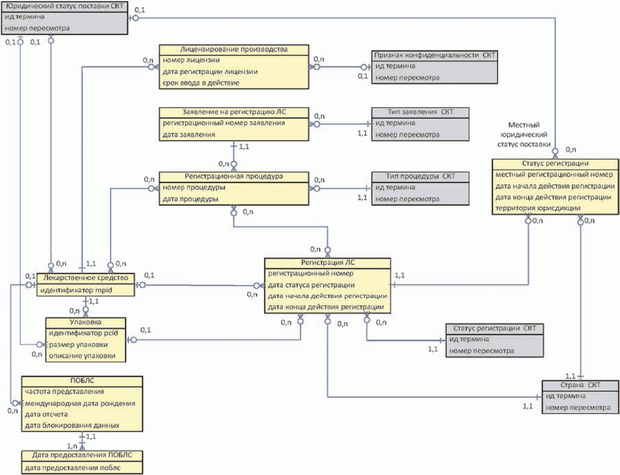 Следующая диаграмма содержит сущности, относящиеся к регистрации лекарственного средства и лицензированию производства.