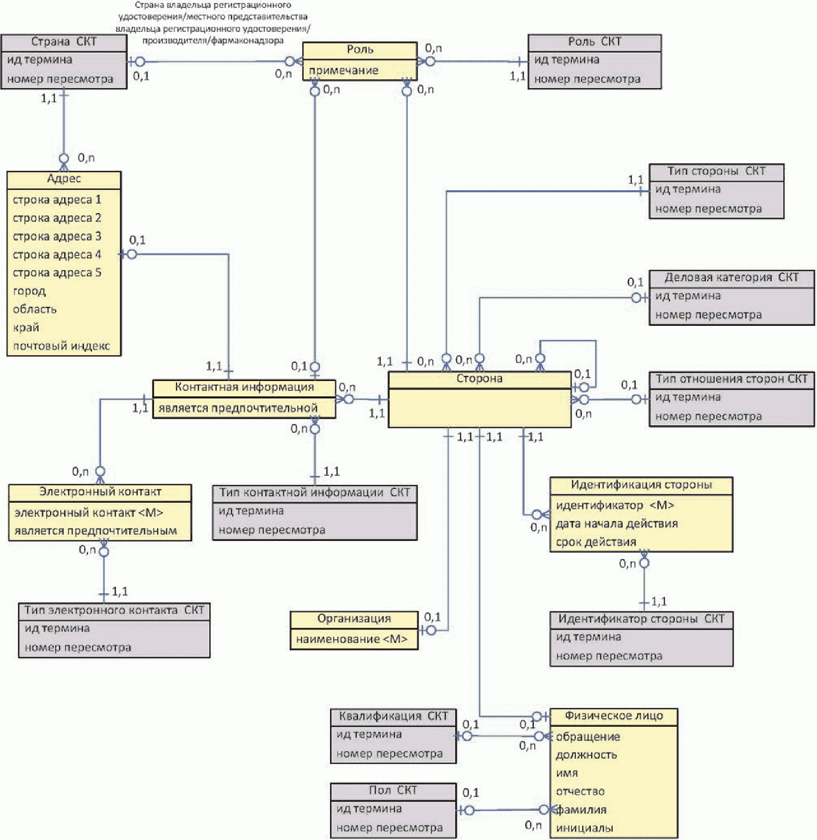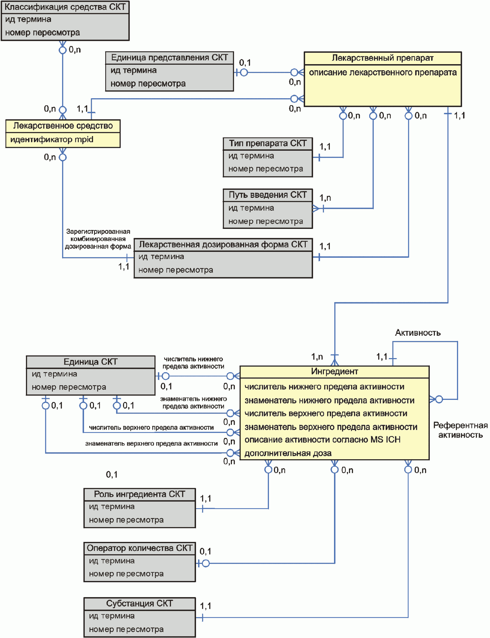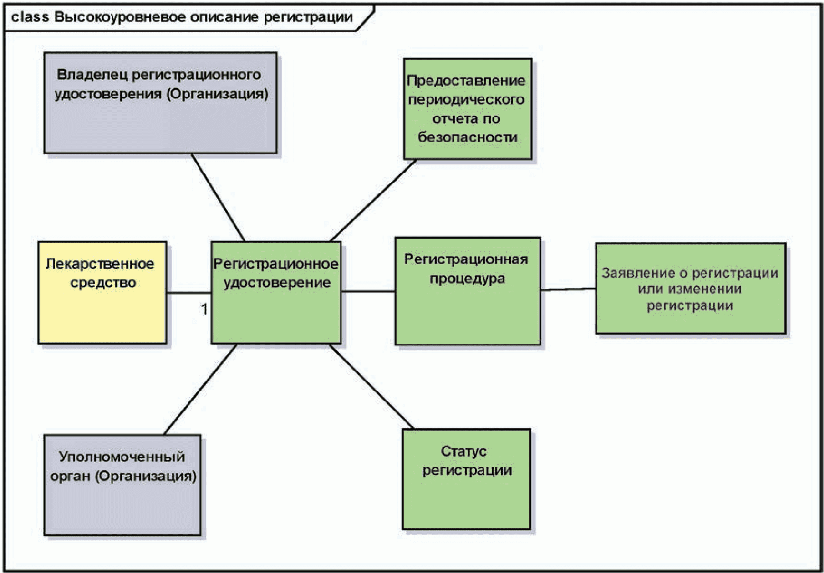 Следующая диаграмма содержит сущности, относящиеся к регистрации лекарственного средства и лицензированию производства.