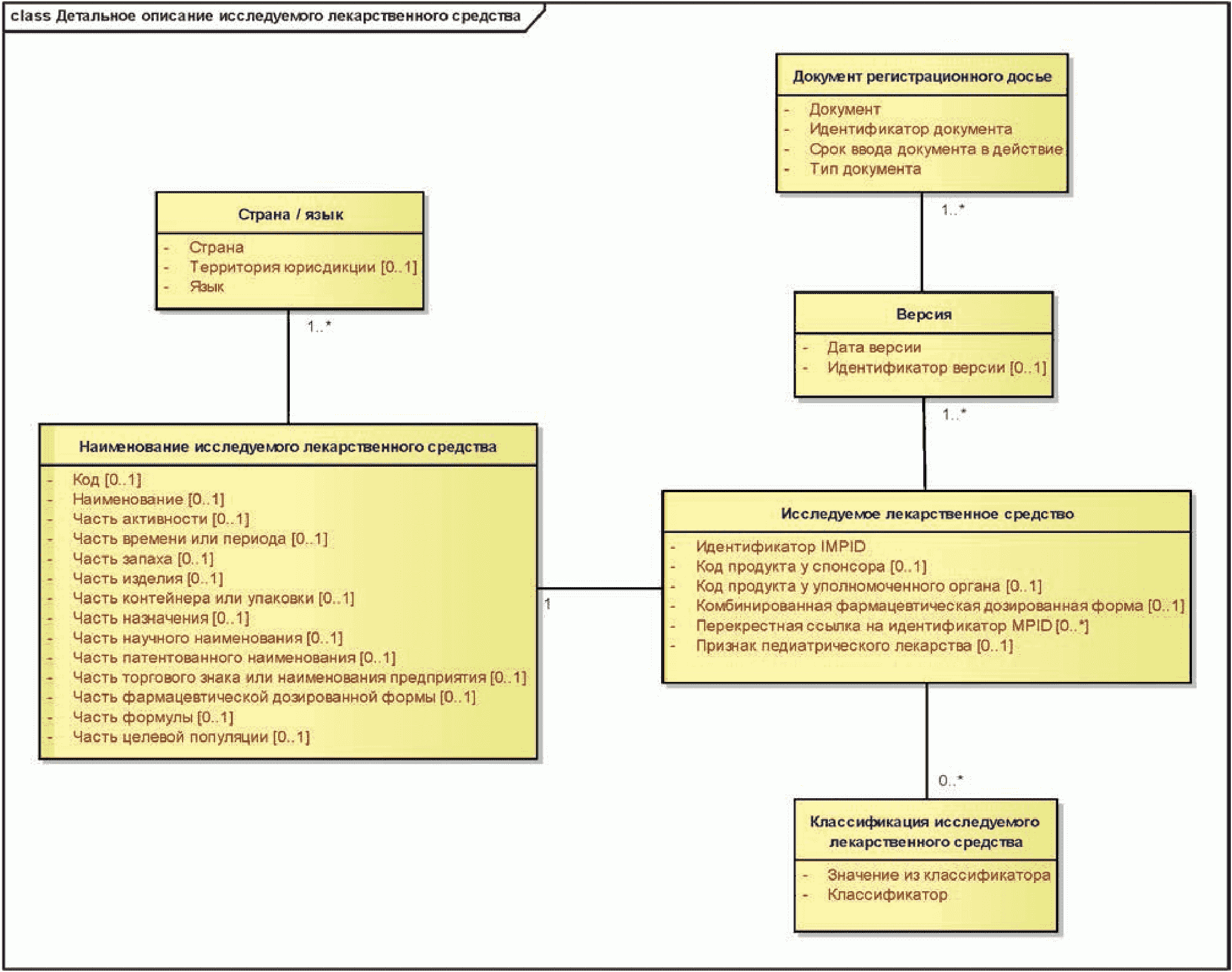 На приведенной ниже диаграмме показаны сущности описания лекарственного средства, включая идентификаторы, наименования и версию.