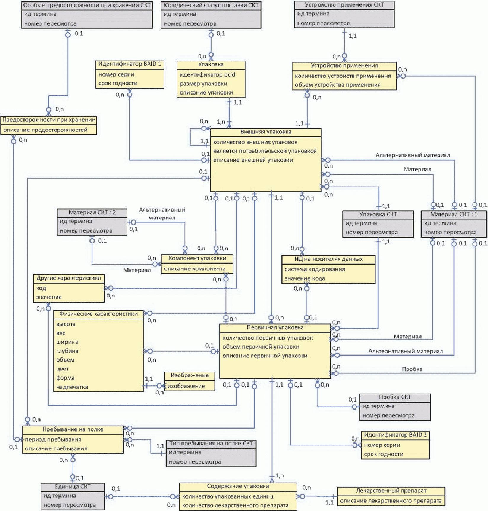 На приведенной ниже диаграмме показаны сущности описания упаковки, включая логическую часть, имеющую идентификаторы PCID и размер упаковки, а также физические детали упаковки, включая внешнюю упаковку, внутреннюю упаковку и т.д.