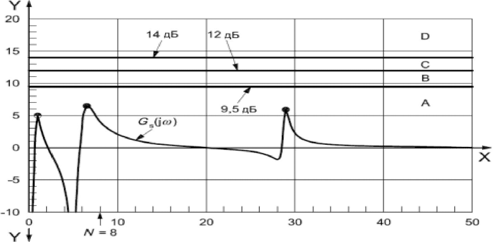 X - частота, Гц; Y - модуль, дБ; A/B - граница