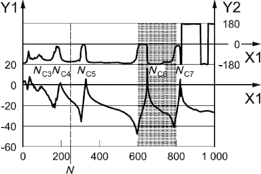 X - частота, Гц; Y1 - модуль, дБ; Y2 - фаза, в градусах