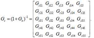 Существует, однако, возможность добавить включения во все цепи управления одновременно и измерить многомерную передаточную функцию разомкнутой цепи с применением компьютерной обработки сигналов. В случае N = 5 осей управления, эта многомерная передаточная функция будет представлять собой матрицу Go, определяемую пятью входными (V1) и пятью выходными (V2) сигналами по формуле