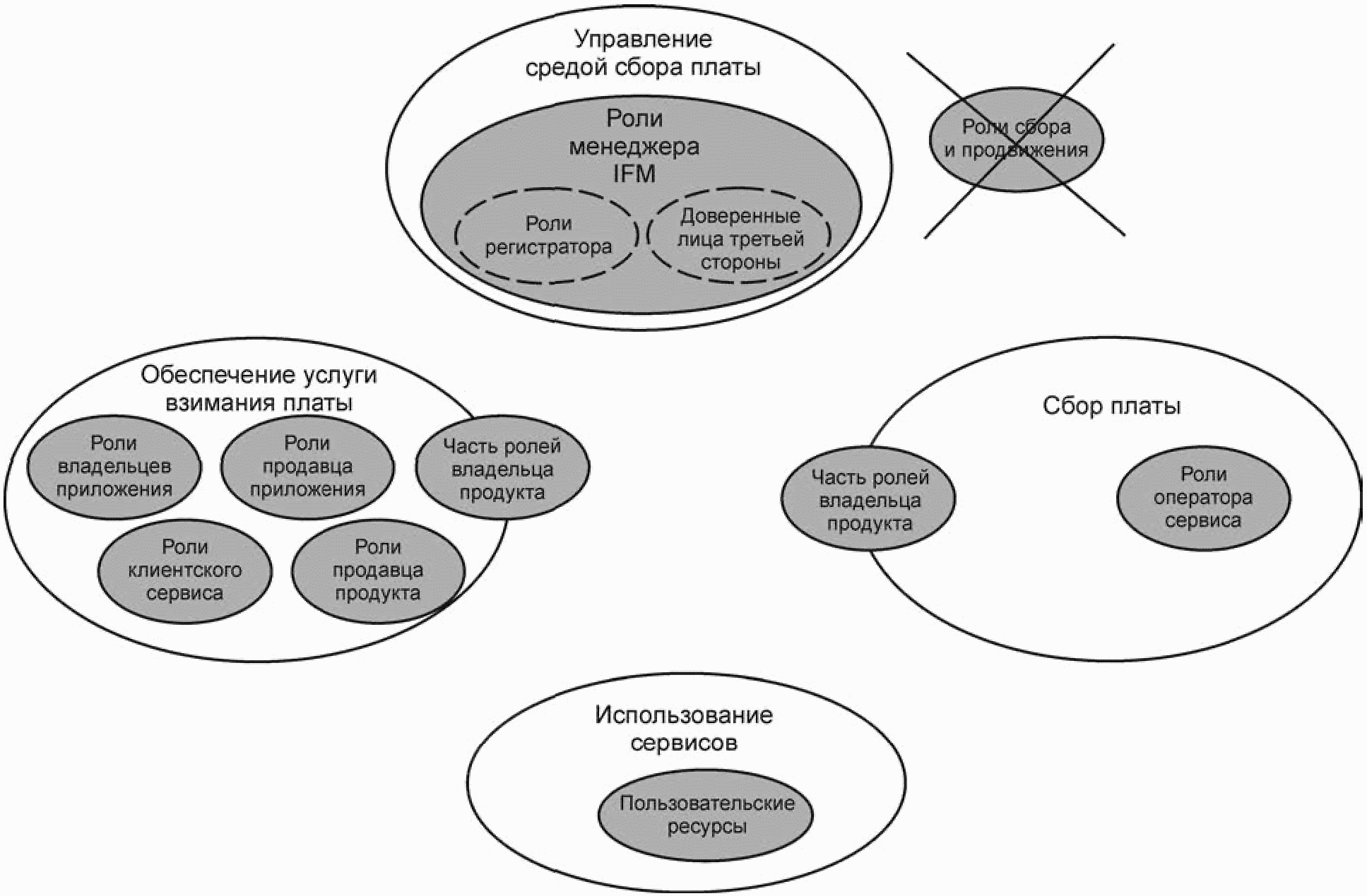 Службы сбора платежей охватывает роли, распределенные по классам "роли поставщика услуг" и "роли оператора исполнения" в диаграмме классов UML.