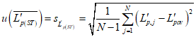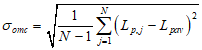 , дБ, берется выборочное стандартное отклонение по результатам шести измерений уровня звукового давления в одной точке установки микрофона, рассчитывается по формуле
