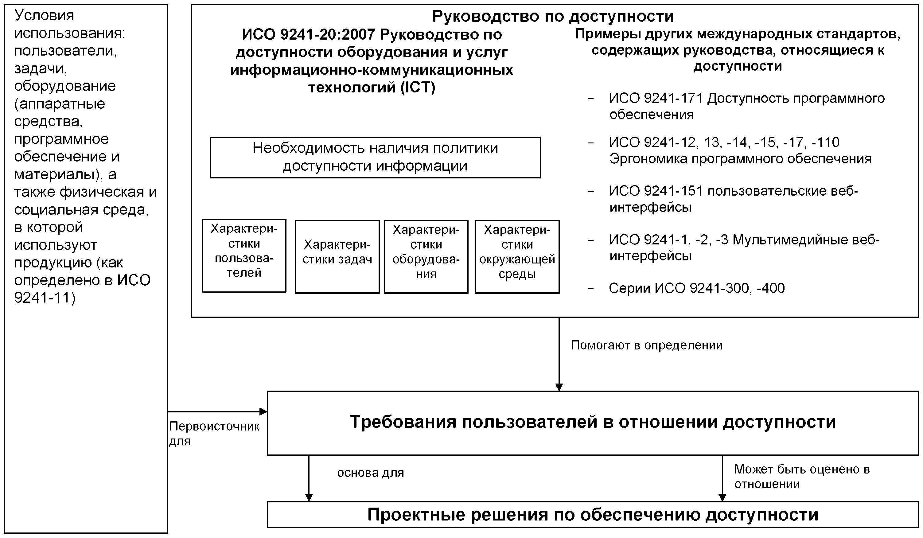 Их изложение предназначено для помощи пользователям этого стандарта в рассмотрении проблем доступности. В стандарте также описаны характерные признаки основной продукции с примерами проектирования, предоставлена информация для планирования, проектирования и разработки оборудования и услуг ICT, а также приобретения и оценки оборудования и услуг ICT. Необходимо признать важность как общего руководства по эргономике, специализированного руководства по доступности, приведенного в этом и других стандартах по обеспечению доступности в достижении полного использования оборудования, программного обеспечения и услуг ICT.