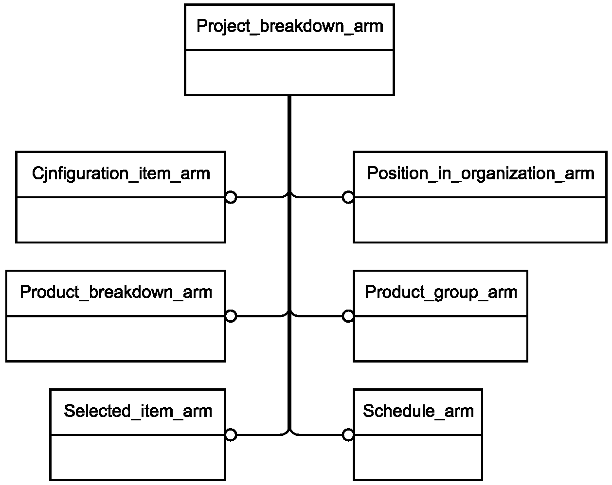 EXPRESS-схема Project_breakdown_arm обозначает структуры проекта и изделия, т.е. того, как дано определение проекта и как осуществляется управление сборкой изделия, классификацией изделия и версиями изделия.