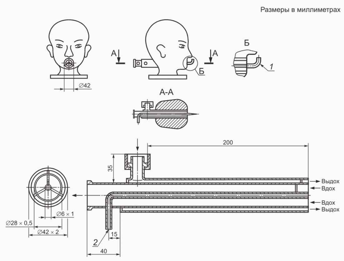 В испытаниях должны участвовать не менее трех человек с различными антропометрическими размерами головы [по вертикальному обхвату - длины круговой линии, проходящей по подбородку и щекам через высшую точку головы (макушки) - 610 - 720 мм, и морфологической высоты лица - расстояния от наиболее углубленной точки спинки носа (переносицы) до наиболее выступающей точки подбородка - 110 - 140 мм].