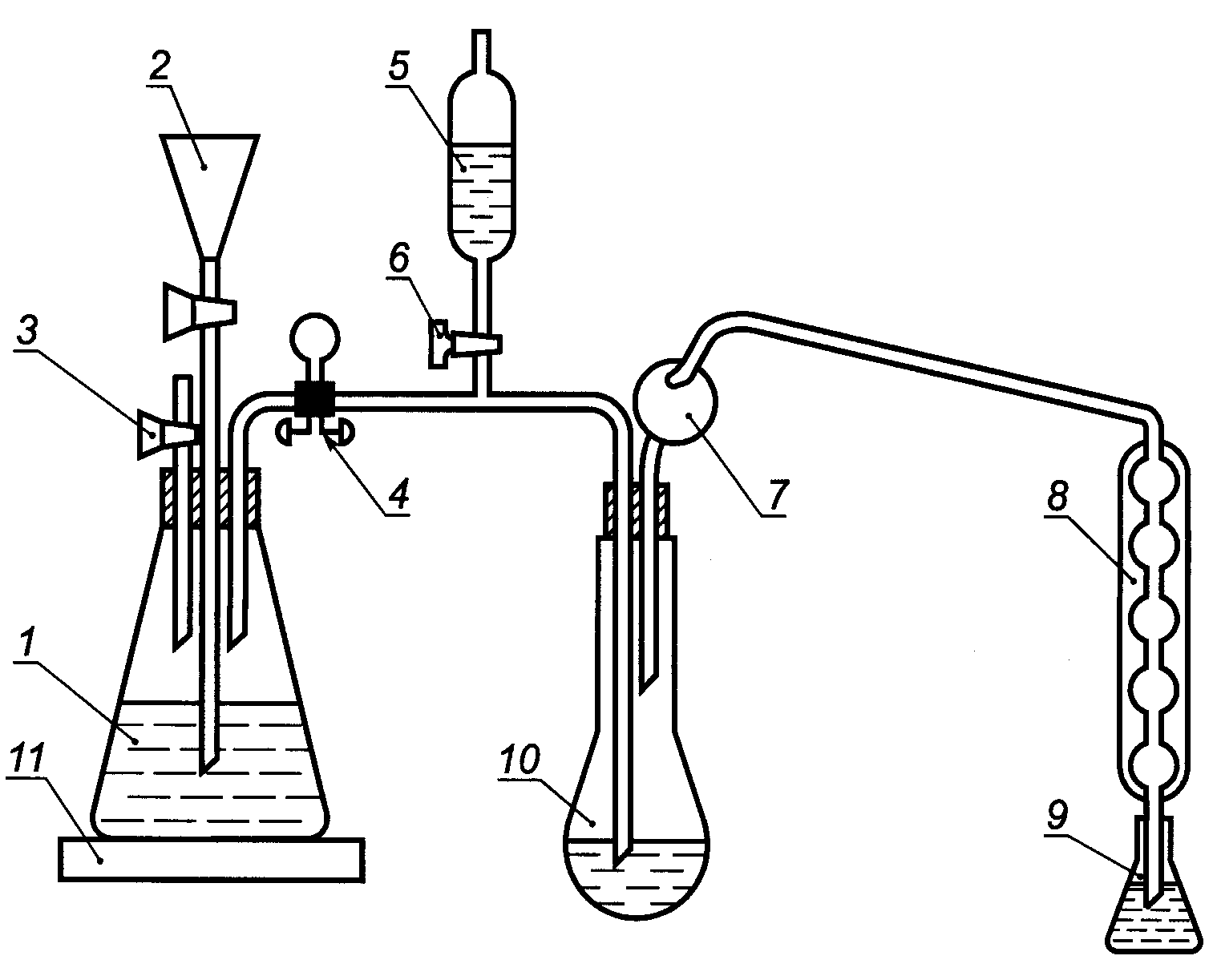В бачок-парообразователь 1 через воронку 2 наливают дистиллированную воду (примерно на 2/3 объема) и открывают кран 3 и зажим 4. Нагревают воду в бачке на газовой горелке или электрической плитке 11. Присоединяют пустую колбу Кьельдаля или кварцевую пробирку 10 к каплеуловителю 7 и воронке для гидроокиси натрия 5 и после того, как вода в бачке закипит, закрывают кран 3. Включают холодильник 8, подставляют под него пустую коническую колбу вместимостью 250 см3 9 и "пропаривают прибор" 5 - 10 мин.