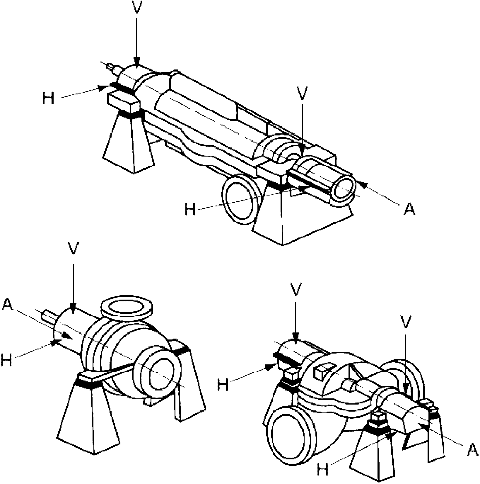 Вместо применяемой обычно пары датчиков можно использовать один датчик, если предварительно установлено, что получаемые с его помощью результаты дают достаточную информацию о вибрации насоса. Однако следует иметь в виду, что направление измерительной оси этого датчика может не позволить получить максимальное значение вибрации в данной плоскости измерений (см.