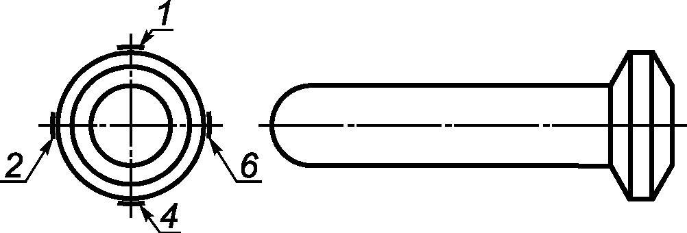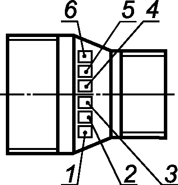 1 - товарный знак завода-изготовителя; 2 - марка стали; 3 - номинальное давление; 4 - номер партии и порядковый номер детали в партии; 5 - номинальный диаметр; 6 - клеймо отдела технического контроля Примечания 1. Для глухих линз с указателем (DN6 - 15) маркировку 1; 2; 3 следует наносить на указателях. 2. Для измерительных диафрагм стрелка указывает направление движения среды. Вход среды со стороны острой кромки дросселирующего отверстия диафрагмы. 3. Знак "+" следует ставить на штуцере со стороны входа среды; знак "-" на штуцере со стороны выхода среды. |