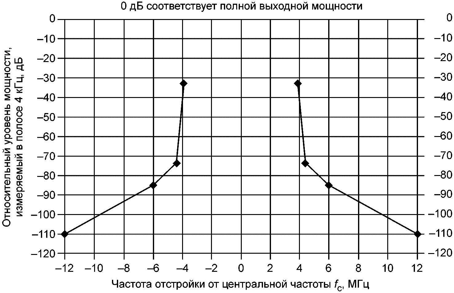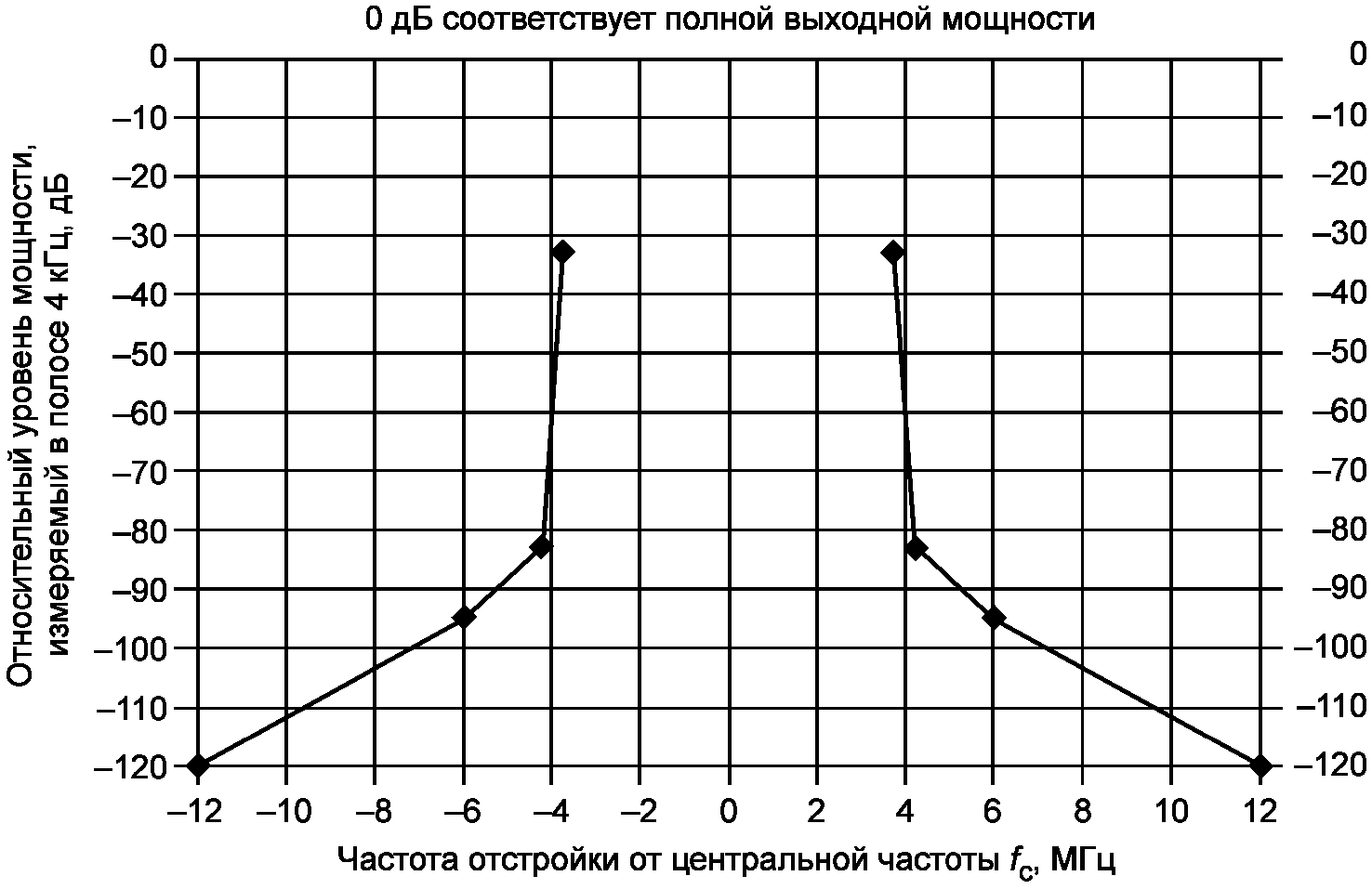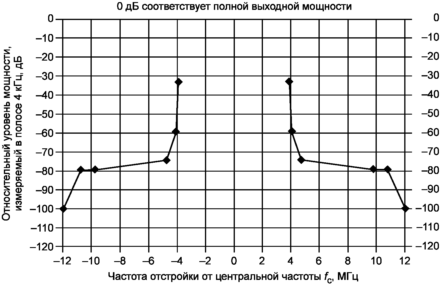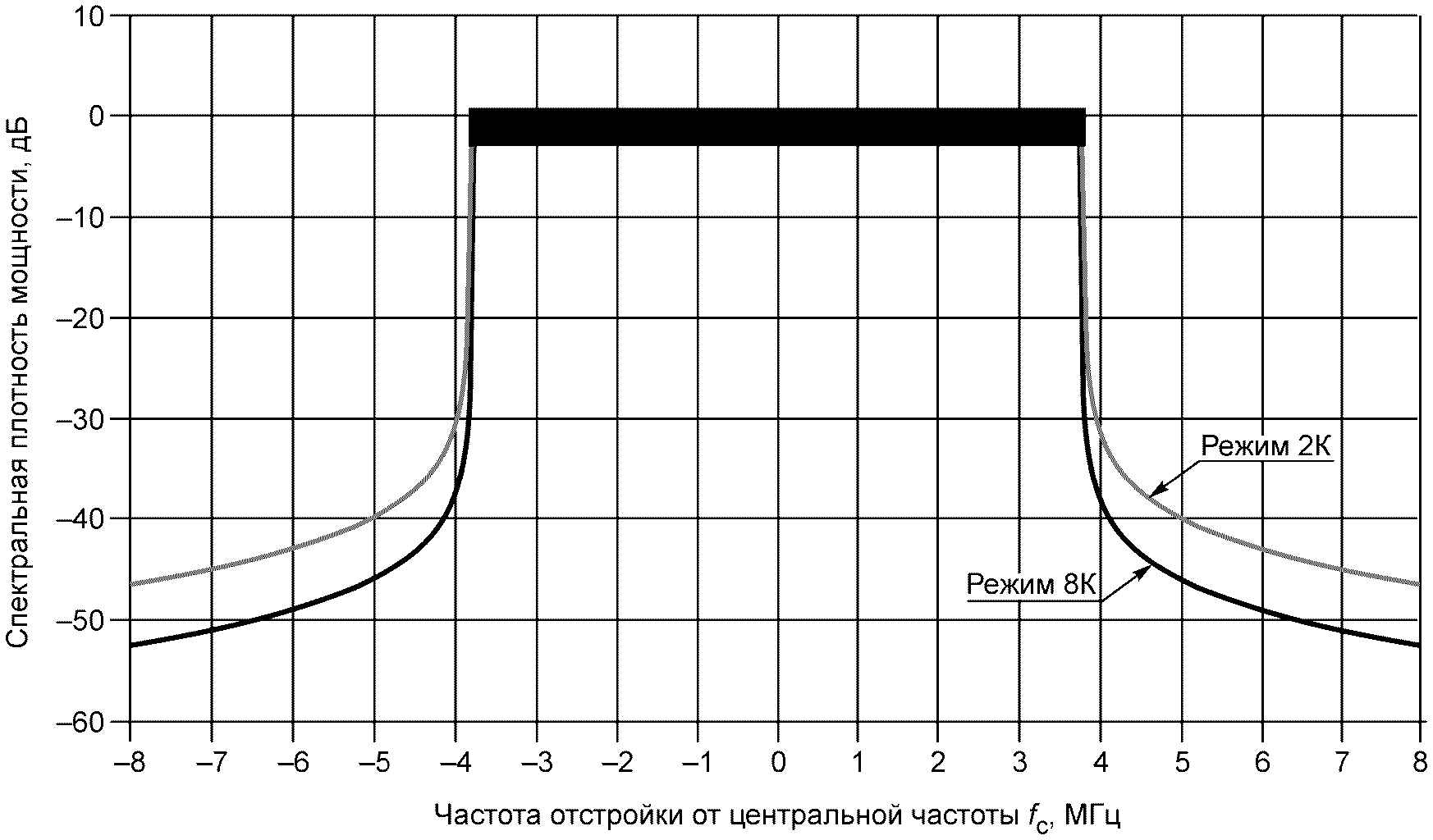 Теоретический спектр сигнала OFDM в режиме 4K с относительным защитным интервалом, равным 1/4, для канала с полосой 8 МГц показан на рисунке Д.4. В пределах номинальной полосы частот, равной 7609,375 МГц, спектральная плотность мощности не остается постоянной.