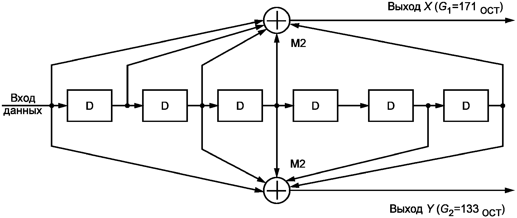 Примечание - При представлении информационной последовательности на входе кодера в виде степенного ряда символы выходной последовательности будут определяться как результат умножения входной последовательности на порождающий многочлен.