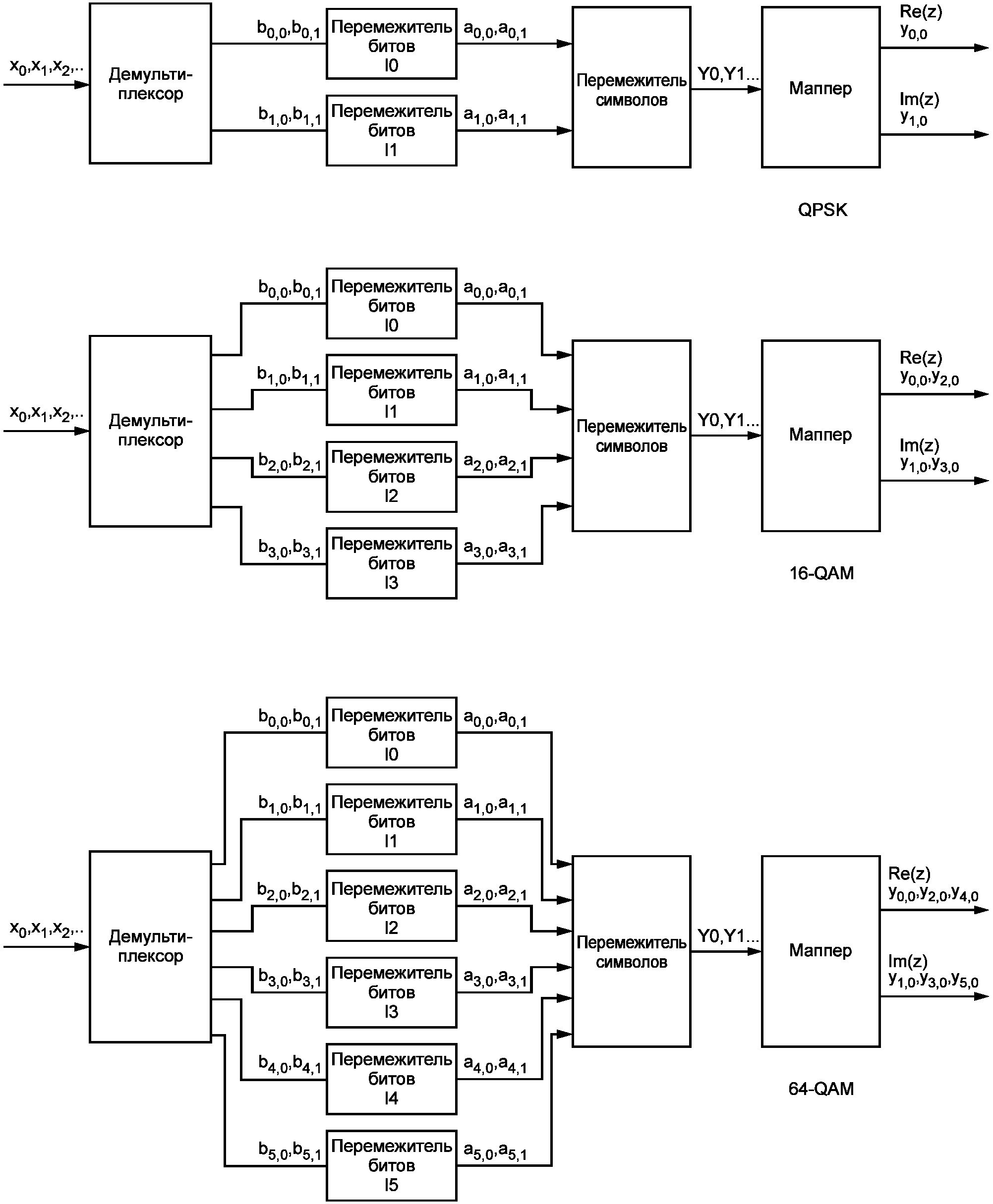 3.22 перемежение побитовое (bit-wise interleaving): Метод перемежения, осуществляемый путем перестановки битов в передаваемой последовательности до модуляции сигнала.