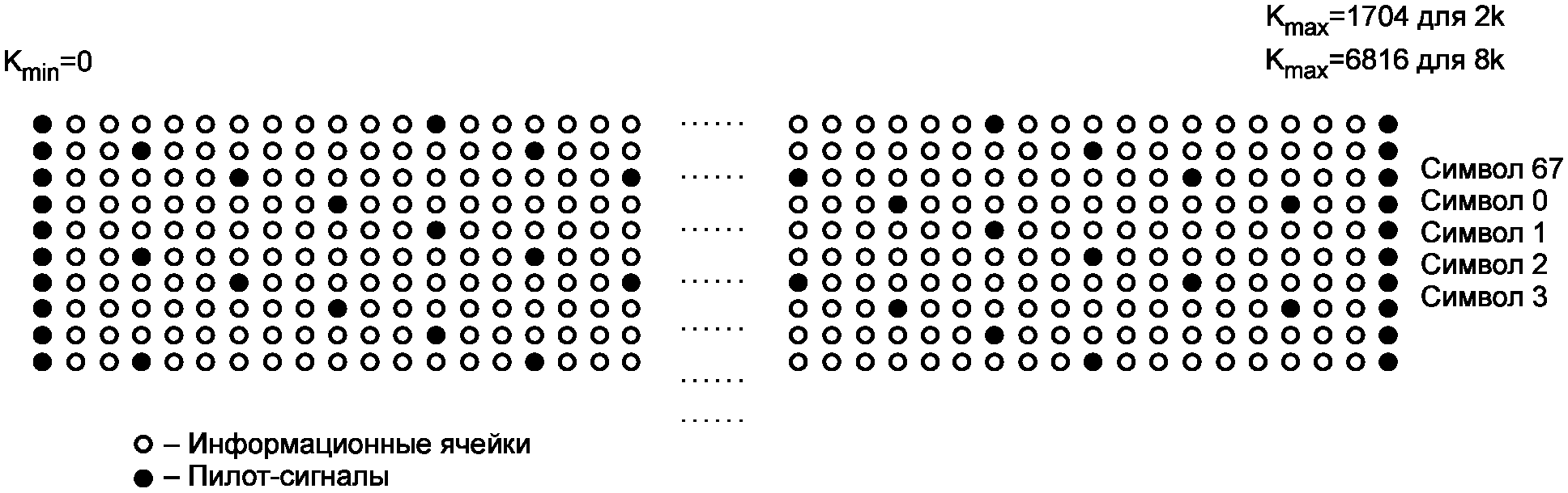 3.33 рассредоточенные пилот-сигналы (scattered pilots): Служебные несущие, размещаемые в пределах ячеек с изменяющимися позициями от символа к символу внутри кадра OFDM.