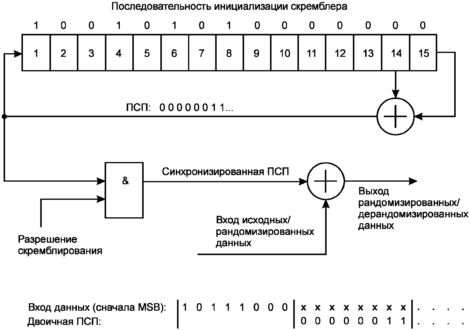 3.38 скремблер (scrambler): Устройство безызбыточного преобразования двоичных данных в кодовую последовательность, символы которой распределены по псевдослучайному закону.