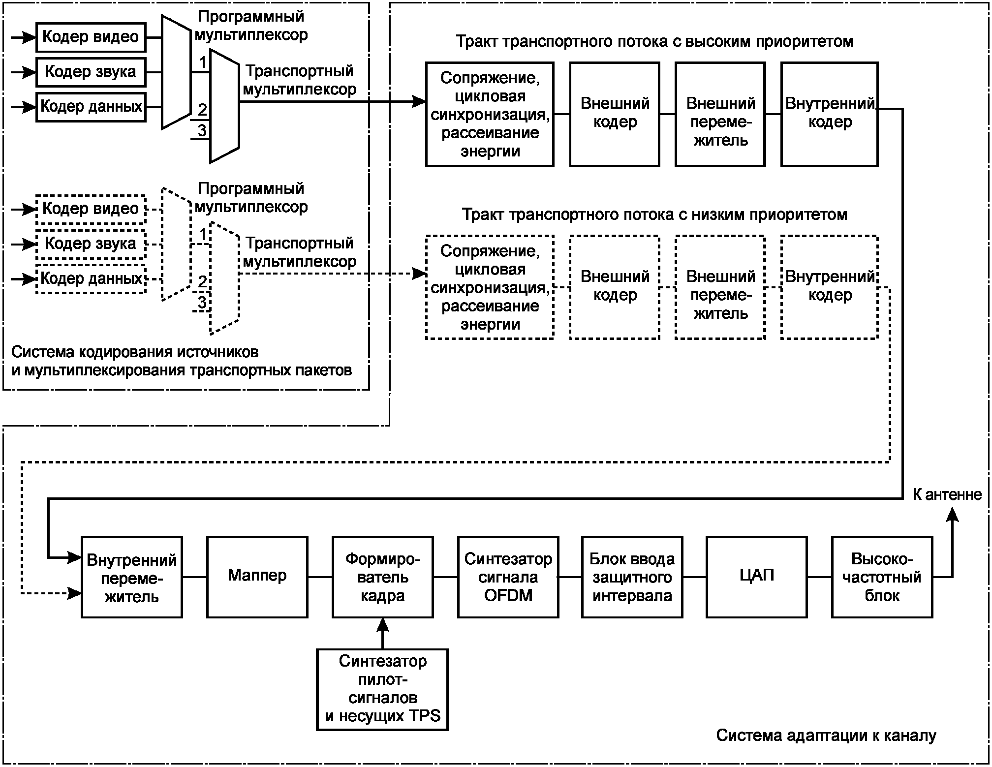 3.37 система эфирного цифрового телевизионного вещания (digital terrestrial television broadcasting system): Система цифрового телевизионного вещания, предназначенная для доставки телевизионных программ потребителю по радиоканалам с использованием наземных передающих центров и предусматривающая кодирование видеосигналов, звуковых сигналов и дополнительных данных, а также мультиплексирование и формирование пакетов в транспортный поток в соответствии с требованиями стандартов MPEG-2 и MPEG-4.