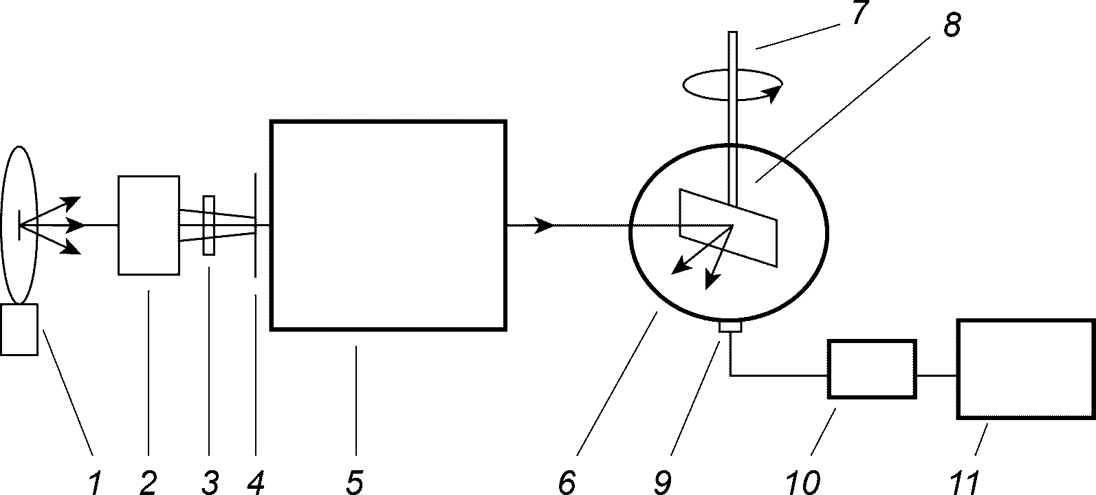 Излучение лампы 1 после конденсора 2 проходит спектральный фильтр 3, выделяющий необходимый спектральный диапазон измерений, и попадает на входную щель 4 монохроматора 5. За выходной щелью монохроматора поток излучения направляют на входное отверстие интегрирующей сферы 6, имеющее форму вертикально ориентированной прямоугольной щели. В держателе поворотного устройства на вертикальной штанге 7 закреплен образец 8, расположенный в центре интегрирующей сферы. Поток излучения направляют на центральную часть исследуемого образца 8. Излучение регистрируют с применением фотодиода 9, входящего в состав фотоприемного устройства 10. Запись измеряемых значений фототока проводят на компьютере 11. Перед фотодиодом установлен экран (на рисунке не показан), закрывающий приемное окно фотодетектора от прямых лучей.