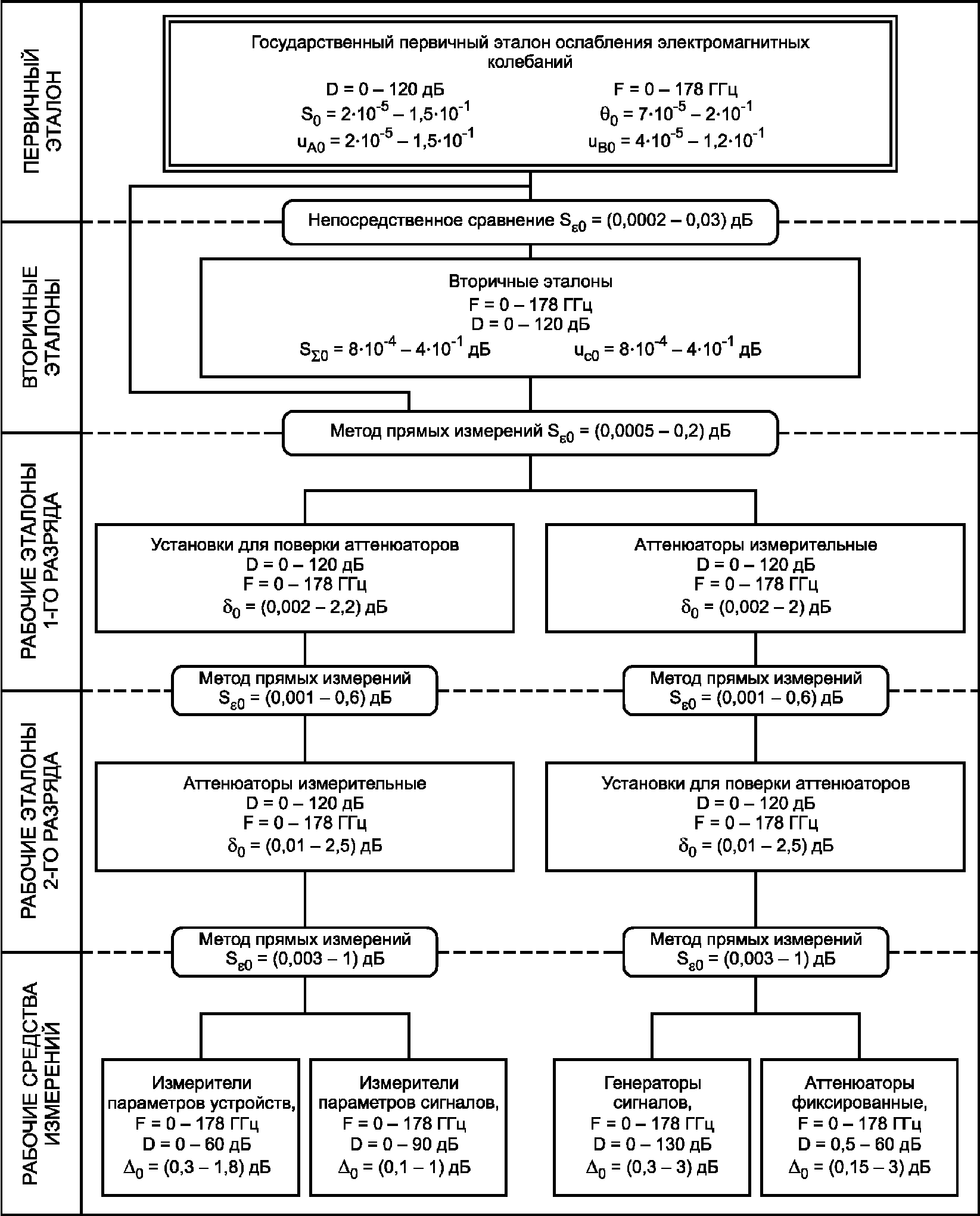 схему для средств измерений ослабления электромагнитных колебаний в диапазоне частот от 0 до 178 ГГц (приложение А) и устанавливает порядок передачи единицы ослабления электромагнитных колебаний - безразмерной величины, выражаемой в децибелах (дБ) в соответствии с ГОСТ 24204, от государственного первичного эталона с помощью вторичных и рабочих эталонов рабочим средствам измерений с указанием погрешностей и основных методов поверки.