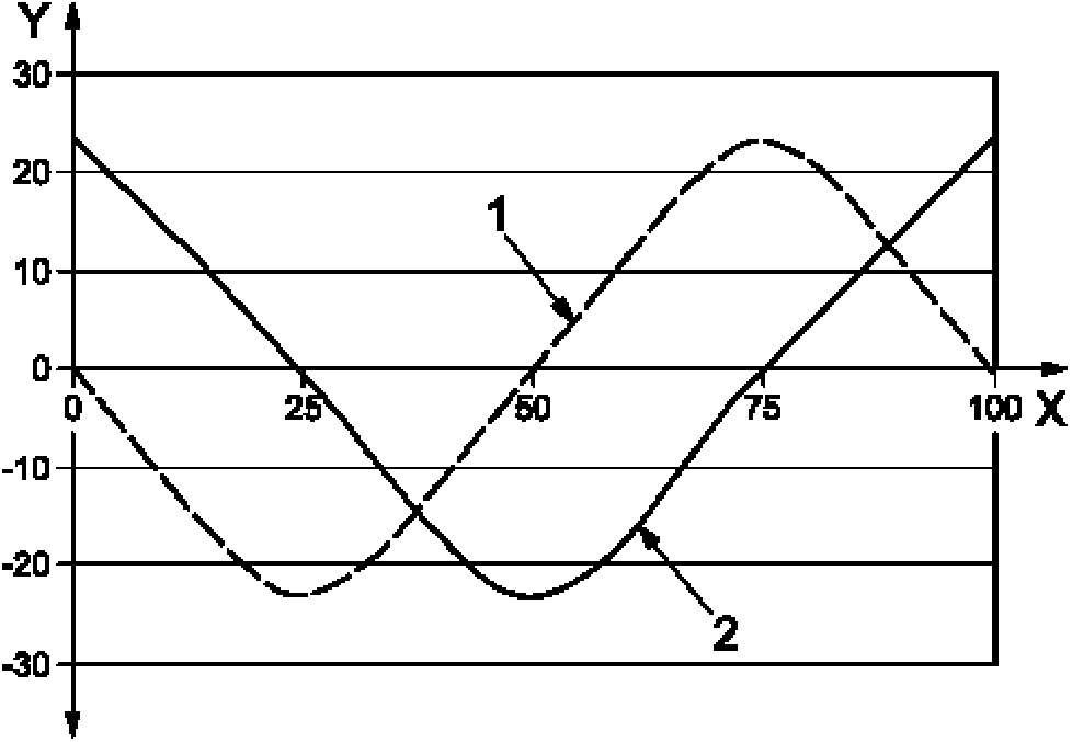 1 - отведение/приведение; 2 - разгибание/сгибание; X - время (в процентах от полной длительности цикла); Y - угол в градусах
