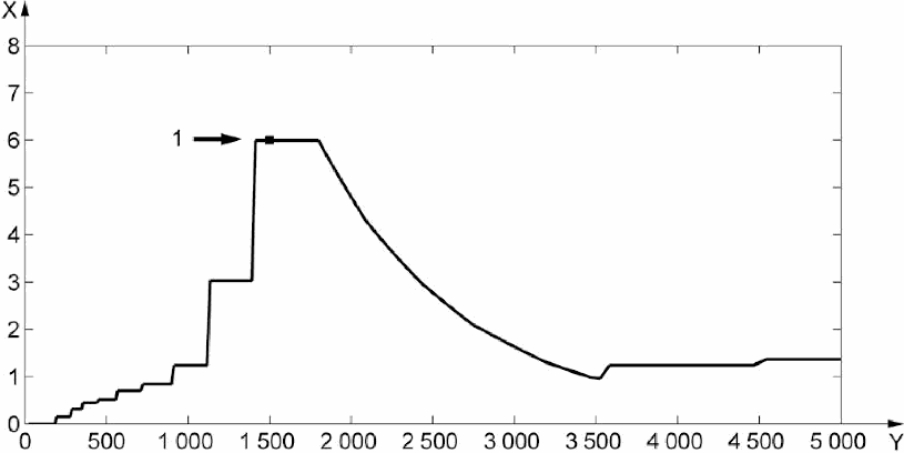 X - заданная громкость; Y - частота (Гц); 1 - заданная громкость = 6·1500 Гц.