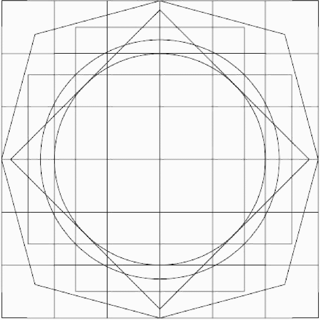 8 | Восьмиугольник, сформированный из линий относительно друг друга в 15° на внешней стороне сетки 1 |