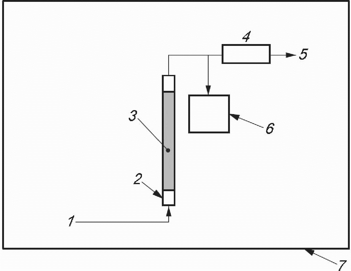 Подсоединяют трубку к установке, на выходе устанавливают детектор формальдегида Formtector XP-308B, а затем начинают подавать поток воздуха, содержащего формальдегид. Поддерживают линейную скорость потока воздуха у поверхности образца на уровне 48 мм/с. Таким образом, при использовании трубки для образца диаметром 12 мм рекомендуется устанавливать расход воздуха 324 мл/мин. Регистрируют выходной сигнал детектора. Пропускают воздух, содержащий формальдегид, через сорбционную трубку до тех пор, пока содержание, регистрируемое детектором, не достигнет 0,5% содержания формальдегида в контрольном газе.