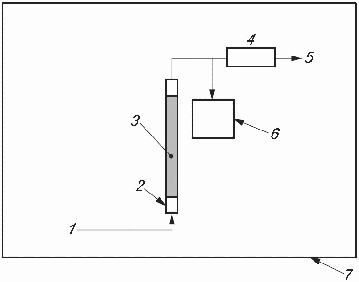 Подсоединяют трубку к установке и начинают подавать в нее воздух, содержащий целевой компонент. Продолжают подавать воздух, содержащий целевой компонент, до тех пор, пока его содержание в воздухе на выходе не составит 0,5% содержания в подаваемом воздухе, и затем определяют сорбционную емкость ws (масса насыщения целевого компонента на единицу массы сорбента) при этом содержании. Время, соответствующее этому содержанию, принимают за время проскока tb.