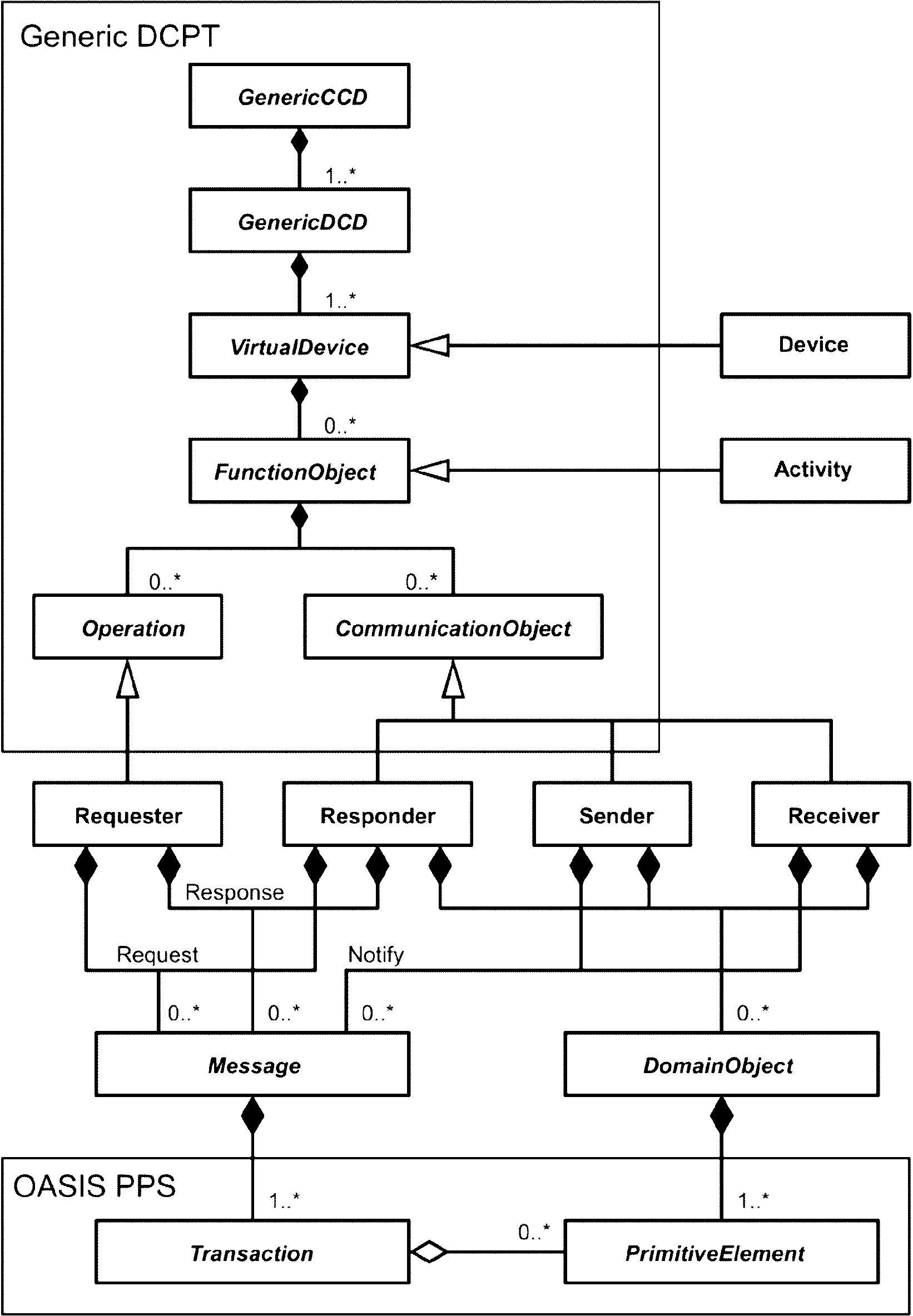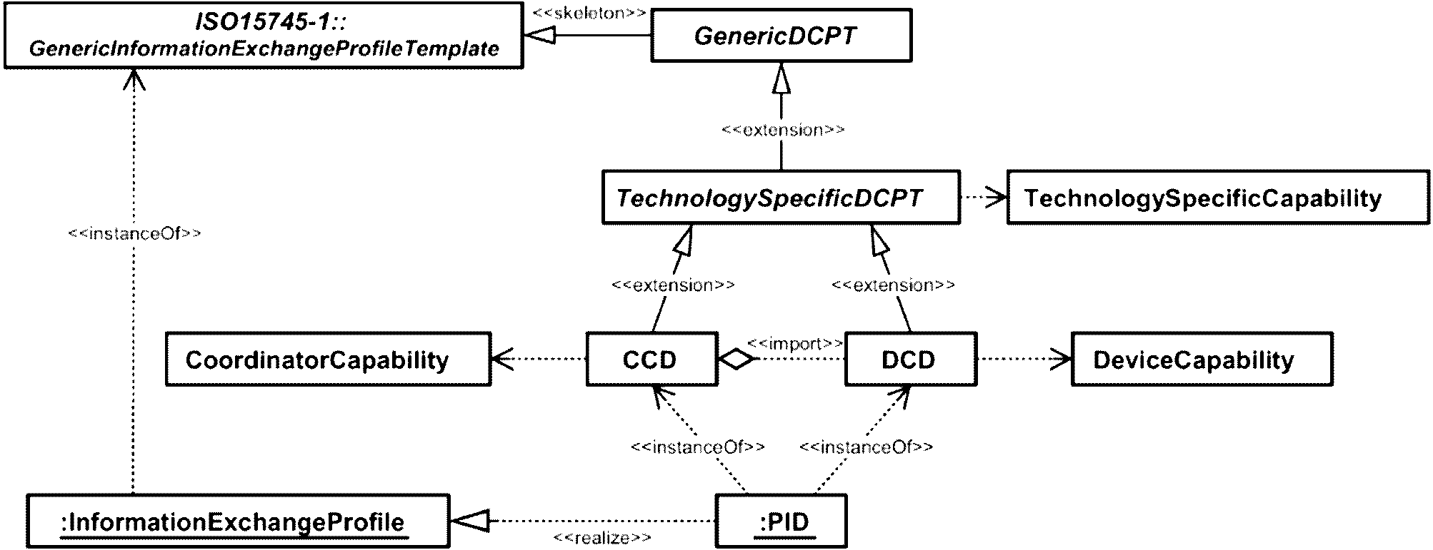 рисунке 1 приведена диаграмма классов, используемых в концепции профиля возможностей устройства в соответствии с настоящим стандартом. Обобщенный шаблон профиля возможностей устройства (далее - DCPT-шаблон) определяют на основе использования обобщенной информации, получаемой из шаблона профиля обмена данными по ИСО 15745-1. Зависящий от выбираемой технологии DCPT-шаблон дополняет обобщенный DCPT-шаблон, что позволяет описывать возможности устройства на языке XML. DCD-описание позволяет дополнить зависящий от выбираемой технологии DCPT-шаблон и описать возможности согласующего устройства на языке XML. CCD-описание позволяет импортировать DCD-описание драйверов устройств и сделать описание возможностей системы. PID-описание определяют путем создания экземпляра CCD-описания (связь один к одному) и DCD-описания (связь один ко многим). PID-описание является реализацией профиля информационного обмена данными согласно ИСО 15745-1 и может использоваться вместе с другими профилями, указанными в настоящем стандарте.