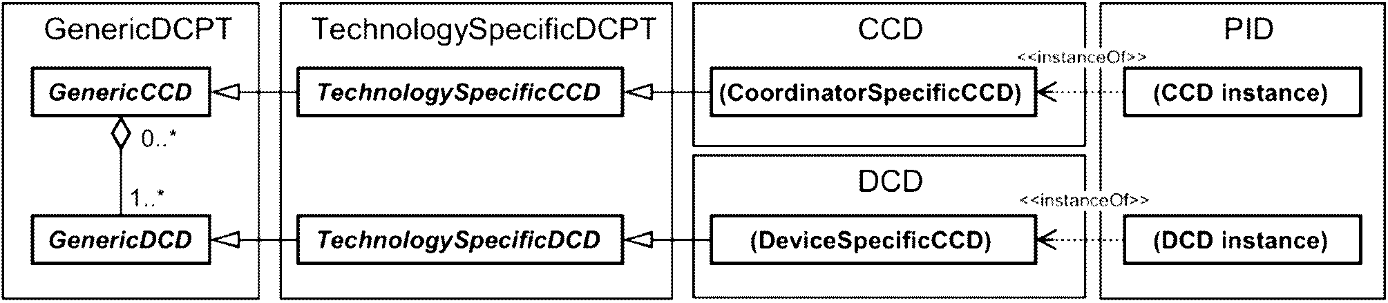рисунке 2 приведена диаграмма CCD- и DCD-классов, используемых в данной концепции. Обобщенный DCPT-шаблон позволяет определить совокупность обобщенных CCD- и DCD-описаний. Обобщенное CCD-описание характеризует обобщенные возможности согласующего устройства, обобщенное DCD-описание - обобщенные возможности виртуального устройства. Зависящий от выбираемой технологии CCD-класс в зависящем от технологии DCPT-классе содержит обобщенное CCD-описание и характеризует зависящие от технологии возможности согласующего устройства. Зависящий от выбираемой технологии DCD-класс содержит обобщенное DCD-описание и характеризует зависящие от выбираемой технологии возможности виртуальных устройств.
