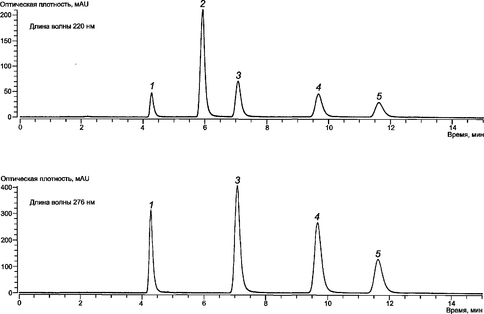 Каждый пик на хроматограмме идентифицируют по времени удерживания и длине волны ультрафиолетовой области спектра. Типичные УФ-спектры приведены на рисунке 3, но их вид может слегка изменяться в зависимости от конкретных приборов.