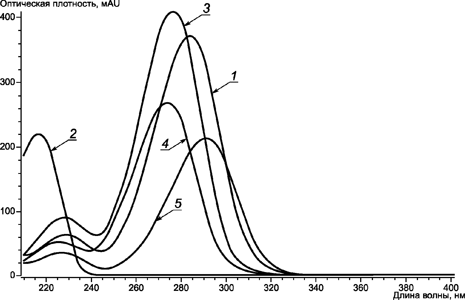 Максимальное поглощение: 1 - 280 нм; 2 - 215 нм; 3 - 274 нм;