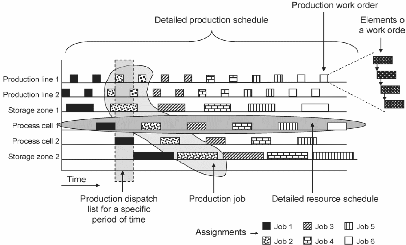 При планировании и разработке графика расходования материалов и производительности требования по количеству и срокам получения конечного продукта (в соответствии с основным календарным планом производства, разработанным на верхнем уровне) переносятся на технологические операции. Данные операции применяются к указанным ресурсам в заданное время на плановую перспективу. Рассматриваемый процесс принятия решений касается прежде всего технологических операций. Далее принимается решение о возможностях ресурсов и производственных ресурсов промежуточных материалов по отношению к ассоциированным операциям. На данном уровне принимаются во внимание план сбыта продукции и план заказов.