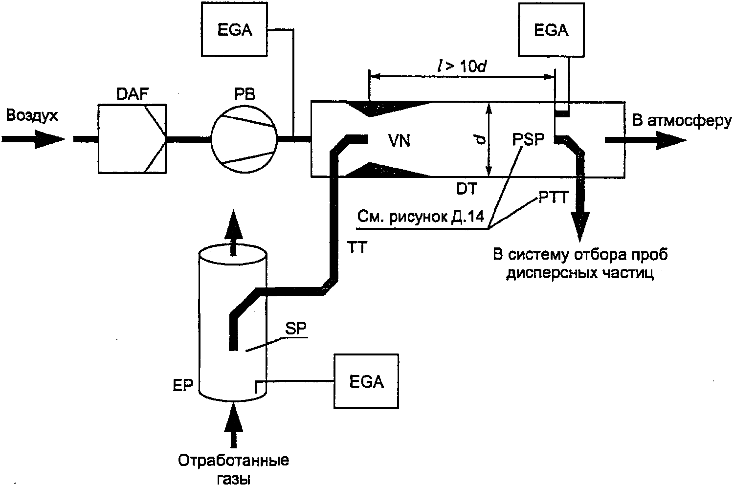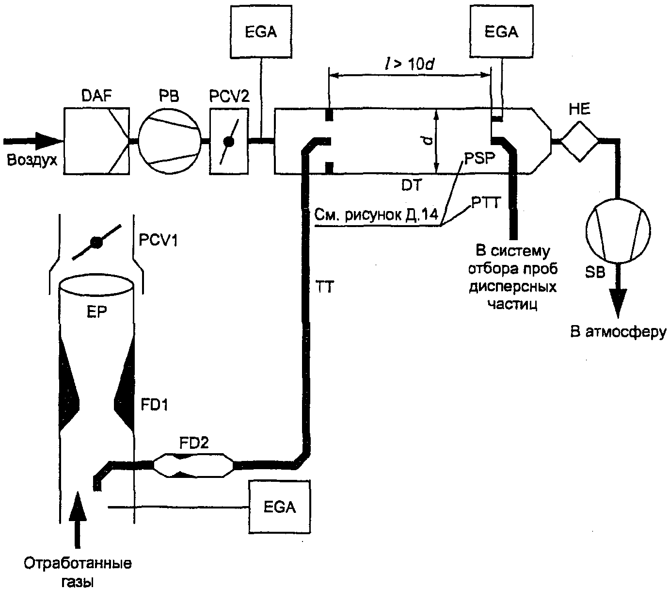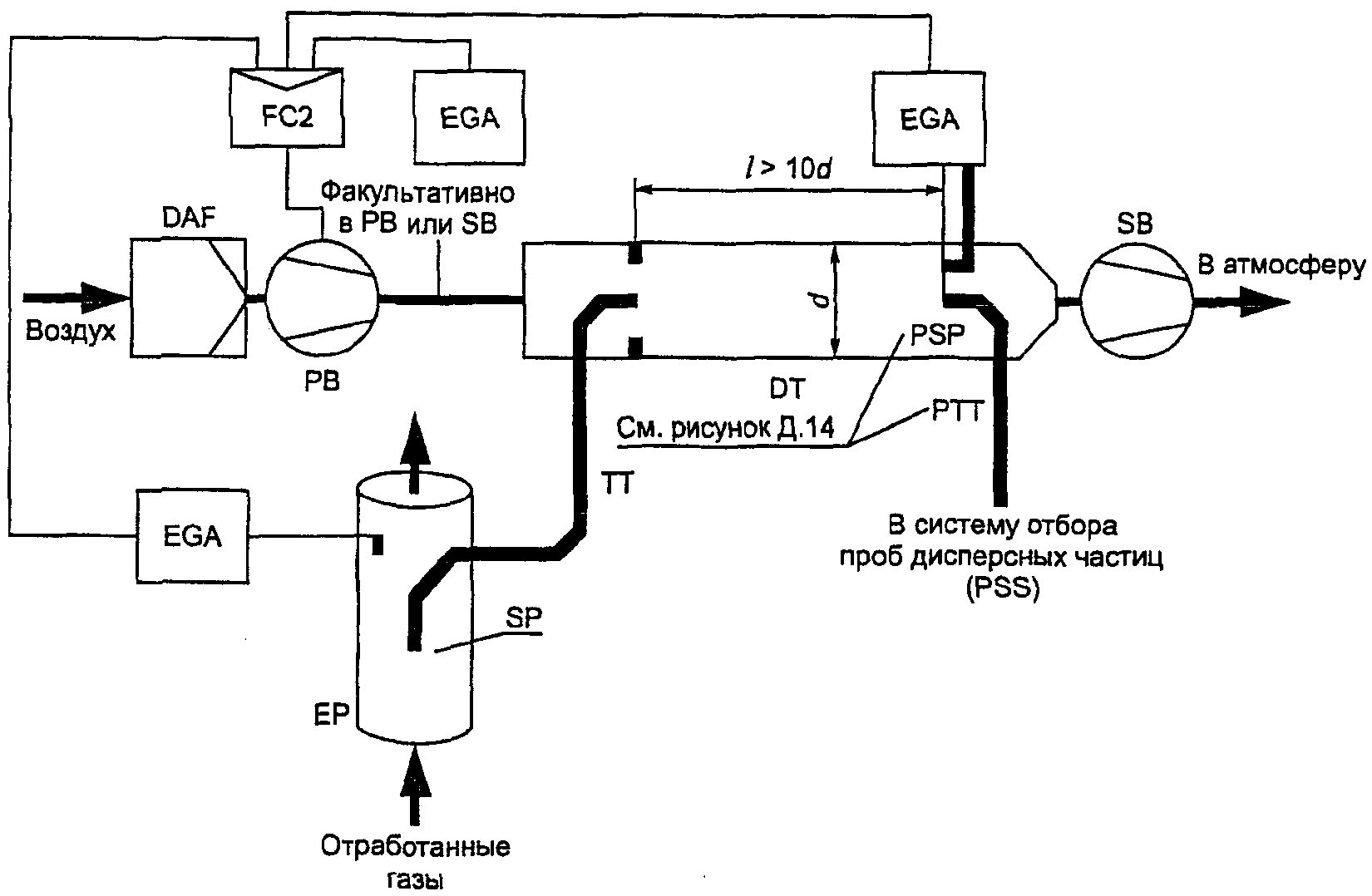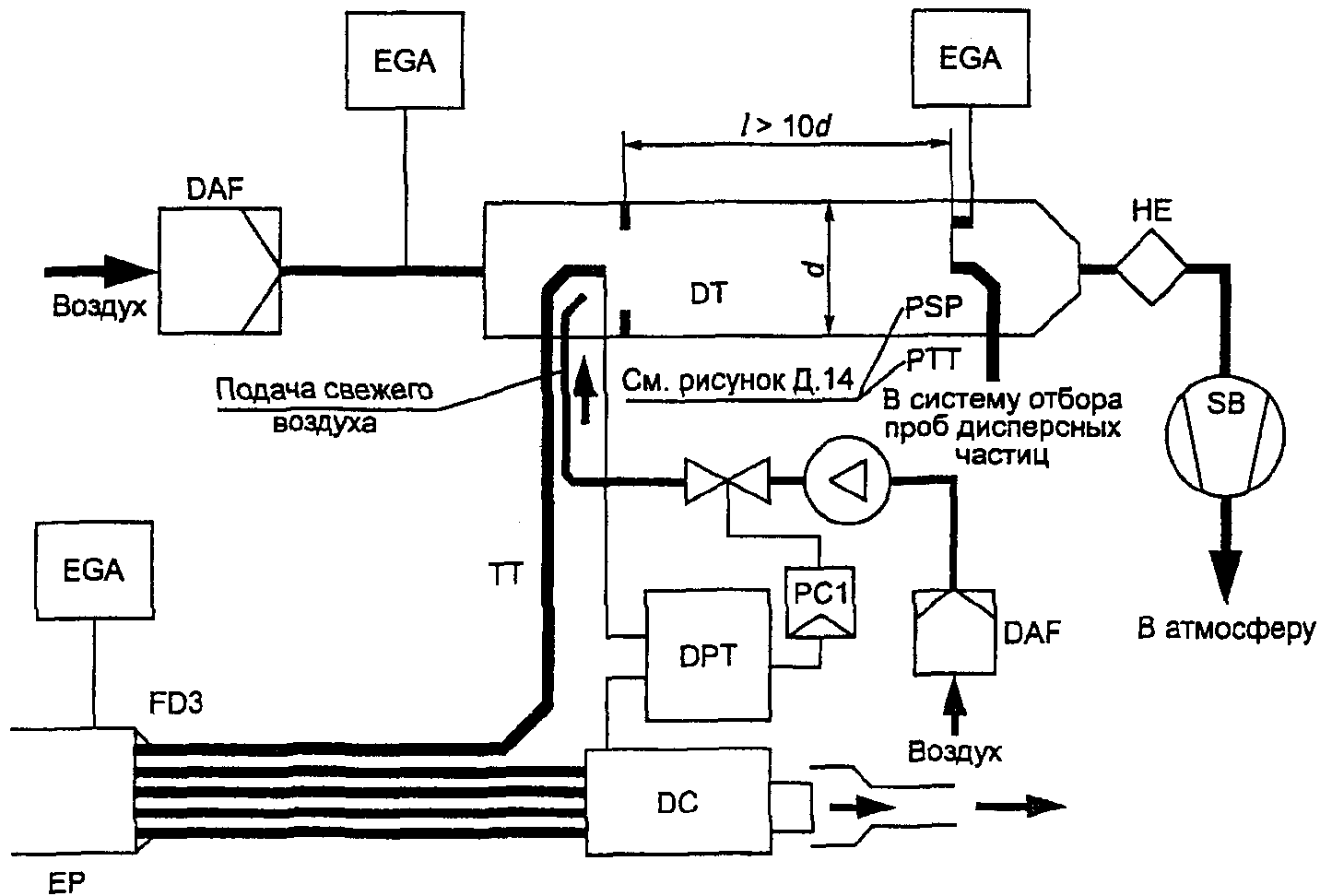 Примечание. Если наружная температура около пробоотборника PSP, патрубка PTT, туннеля SDT и фильтродержателя FH менее 293 К (20 °C), то необходимо предусмотреть соответствующие меры, исключающие осаждение дисперсных частиц на холодных стенках этих устройств. Поэтому рекомендуют их подогрев и/или изоляцию в пределах, устанавливаемых соответствующими предписаниями, а также поддержание температуры на поверхности фильтра в процессе осаждения пробы не менее 293 К (20 °C).