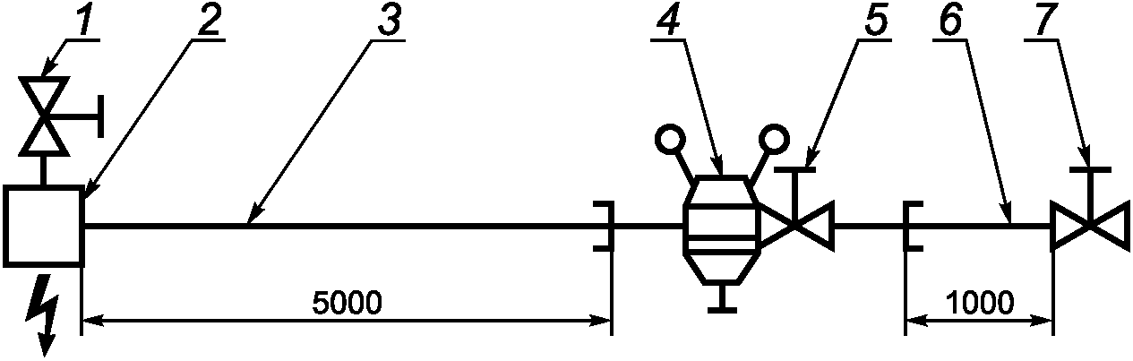 Испытанию на распад ацетилена подвергают три образца редукторов. Испытательную установку (рисунок В.1) конструируют так, чтобы она могла выдержать последствия испытания. Длина входного рукава (3) редуктора и испытуемого образца (4) должна быть 5 м, выходного рукава (6) - 1 м. Внутренний диаметр обоих рукавов равен 12 мм при условии, что диаметр седла редуктора не больше 12 мм (если более 12 мм, то диаметр рукавов должен быть 25 мм).