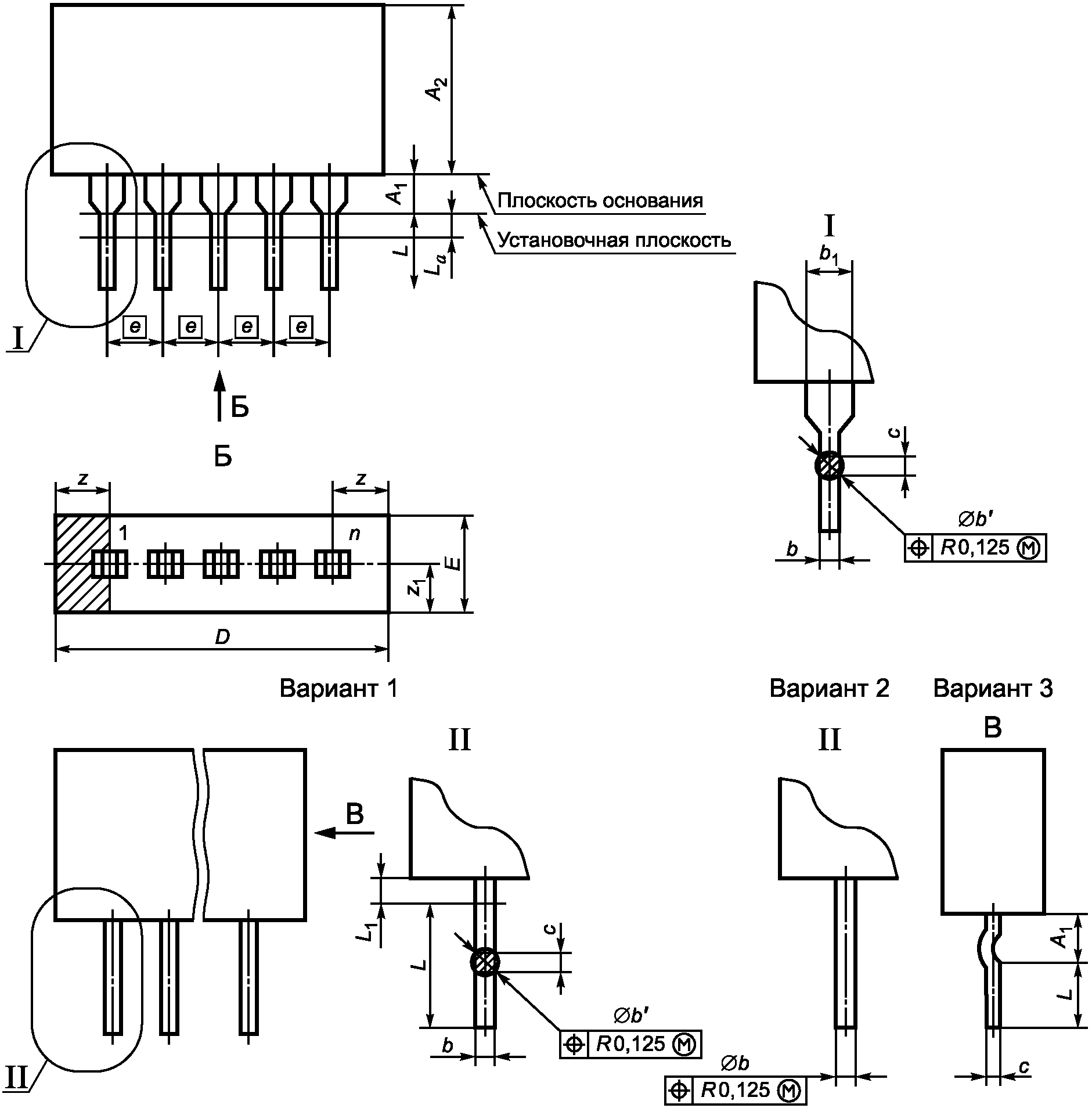 Примечания. 1. Значения размеров 2. Положение установочной плоскости определяют после полного вставления выводов микросхем в отверстия диаметром (0,6 +/- 0,05), (0,8 +/- 0,05) или (1,00 +/- 0,05) мм в зависимости возрастания значений, причем центры этих отверстий должны находиться в сетке координат 4. Форма изгиба вывода и контур вывода в пределах размера 5. Значения размеров b, 8. Размер 9. Допускается только три диапазона значений размера L, если оговорены специальные выводы для автоматизированной установки: а) 2,54 - 3,00 мм; б) 2,9 - 3,4 мм; в) 3,2 - 3,9 мм. Диапазон значений 2,9 - 3,4 мм является предпочтительным. | |||