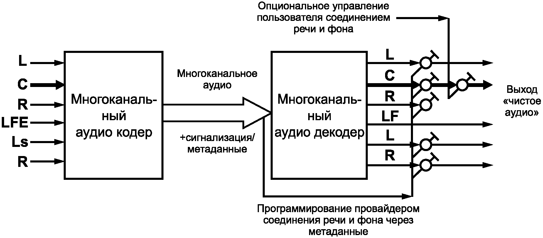 Принципы обработки сигналов в приемнике-декодере SA для случая Clean Audio, когда основное аудио передается в формате стерео, показаны схематически на рисунке Г.2.