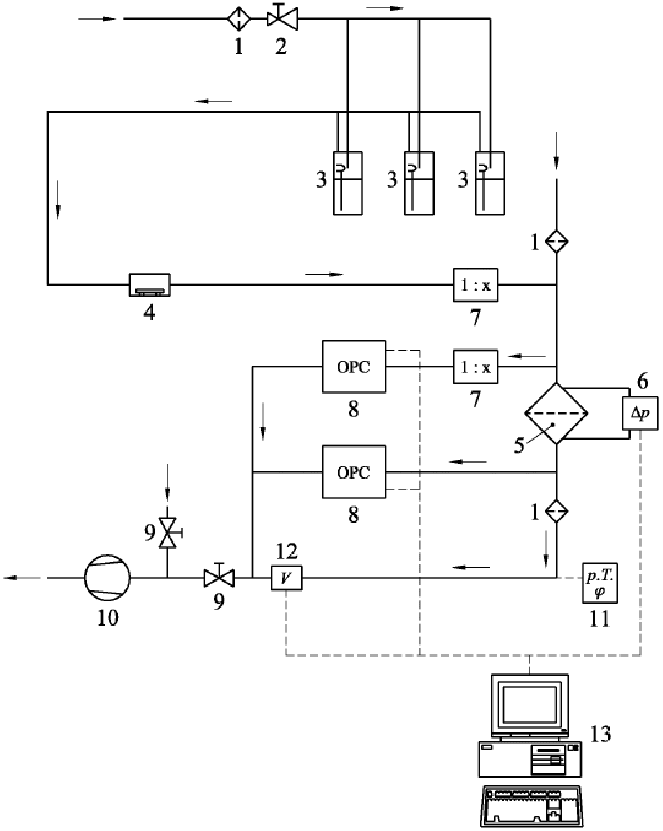 Определение счетной концентрации частиц при испытаниях плоского фильтрующего материала с помощью монодисперсного аэрозоля выполняют методом общего счета с использованием счетчика ядер конденсации. Схема стенда показана на рисунке 1.