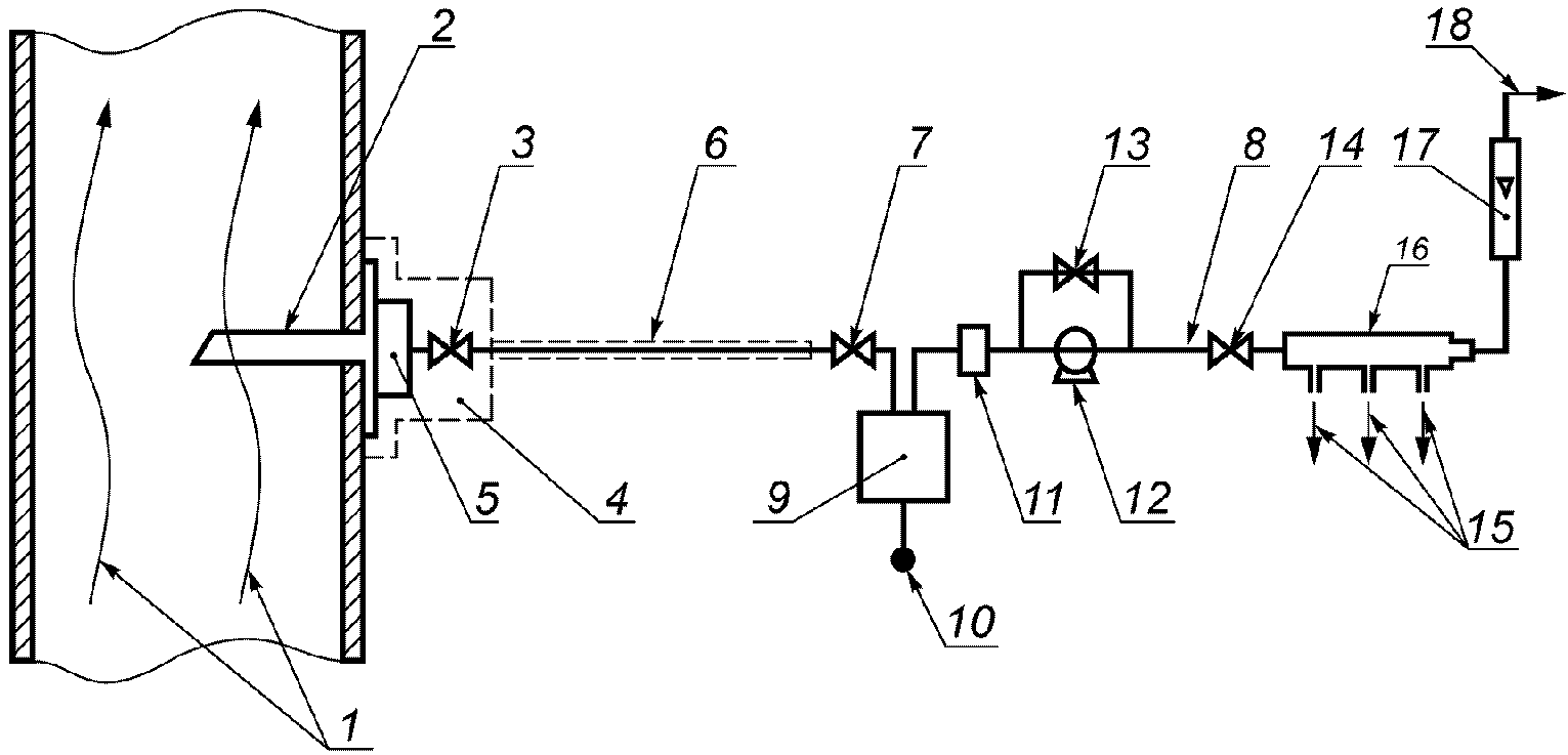к газоанализаторам; 16 - коллектор; 17 - расходомер;