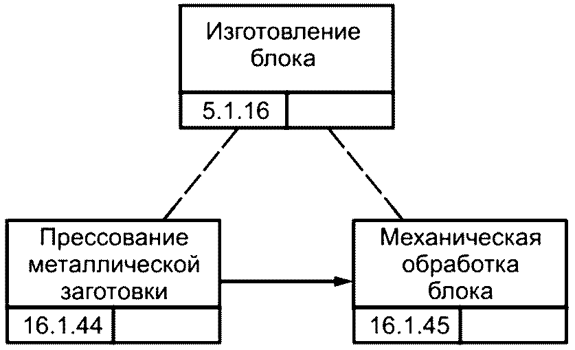 Действие "make_block" (изготовление блока) - это действие процессора с путем, включающее последовательность двух поддействий процессора "produce_molded_metal" (прессование металлической заготовки и "machine_block" (механическая обработка блока).