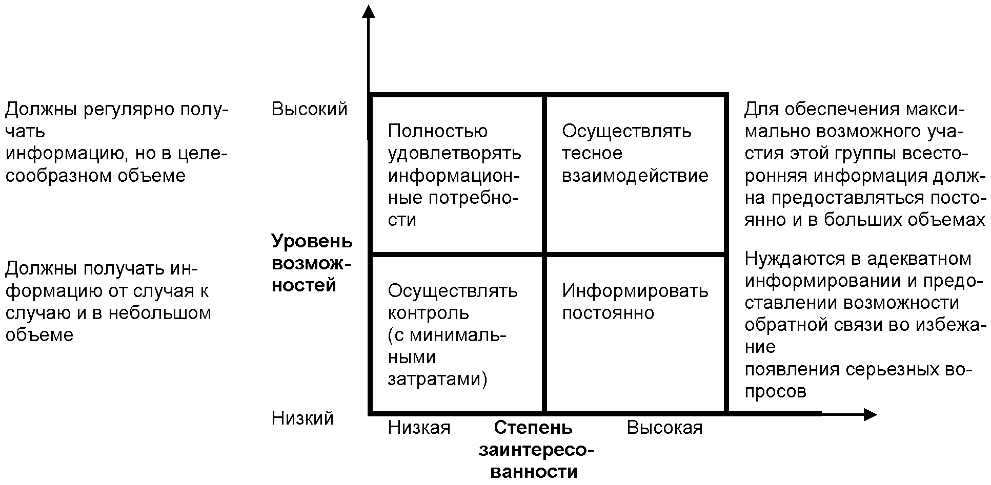 Представленная на рисунке A.1 диаграмма "возможности - интерес" предназначена для идентификации групп и индивидов с разными уровнями влияния и фактического интереса к развитию терминологической политики. Каждая заинтересованная сторона может быть позиционирована в одном из четырех квадратных секторов - в зависимости от предполагаемой степени ее заинтересованности в предлагаемой политике и от уровня влияния, которое она оказывает на принятие соответствующих решений или на проведение данной политики в жизнь. Каждый из квадратных секторов ассоциируется с соответствующими оптимальными стратегиями, наиболее подходящими для взаимодействия с отнесенными к данному квадратному сектору заинтересованными сторонами.