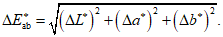 3.2.6 разность цветов МКО 1976 L*a*b*: Разность двух цветовых стимулов, которая определяется как Евклидово расстояние между координатами L*a*b* пространства. Примечания 1 Разность цветов МКО 1976 L*a*b* рассчитывают по формуле (17)2 Для небольших разностей цветов у МКО есть более подходящая формула: см. [2]. | en | CIE 1976 L*a*b* colour difference |
