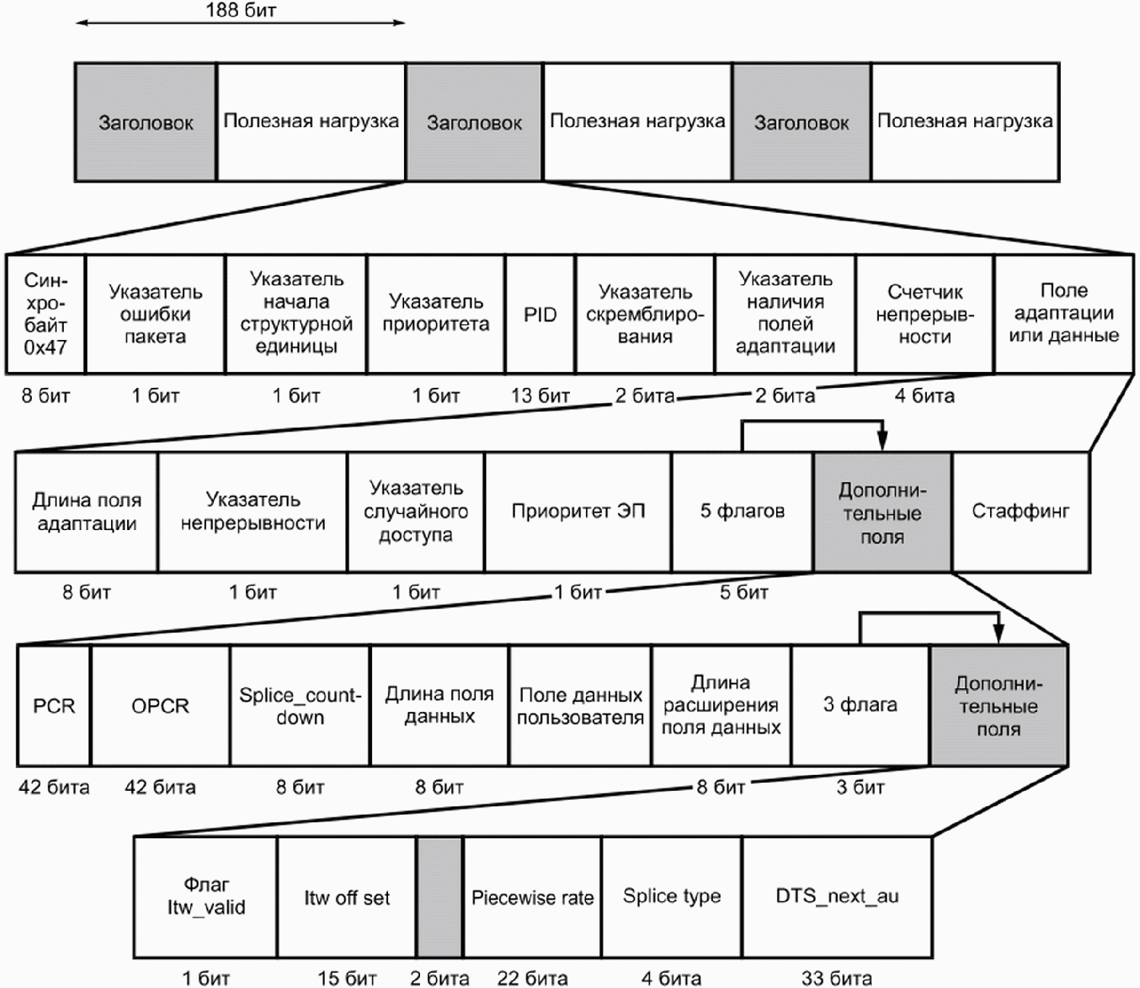 3.1.19 пакетированный элементарный поток; ПЭП (Packetized Elementary Stream; PES): Пакетированный элементарный поток, в котором данные разбиты на пакеты и снабжены заголовками.