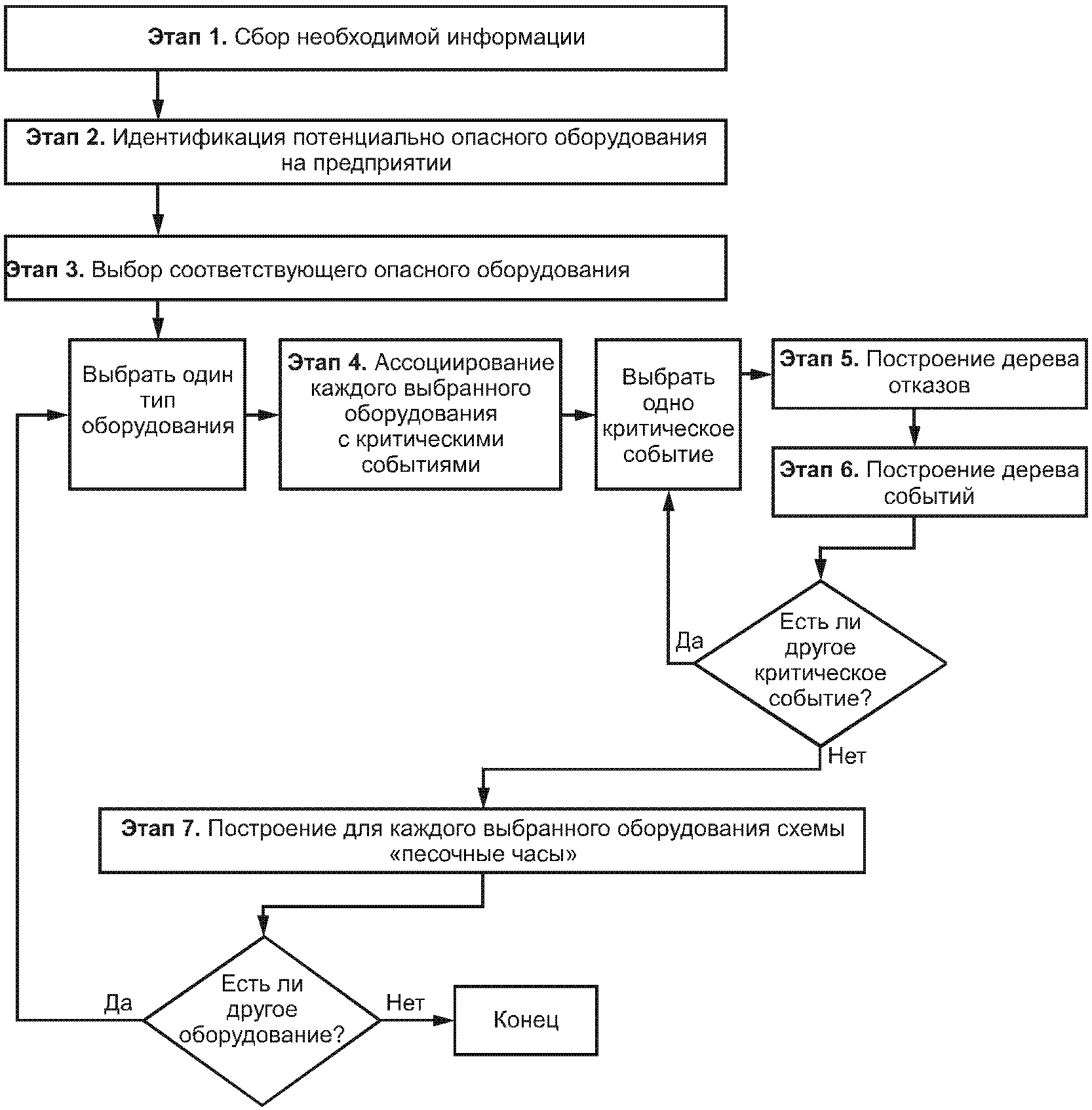 Данная методология предназначена для сбора информации, необходимой для идентификации потенциально опасного оборудования на предприятии и выбора того, которое может быть связано с возникновением значительных инцидентов. Дерево отказов и дерево событий строятся для каждого критического события на основе родовых деревьев, предлагаемых данной методологией. Комбинация дерева отказов и дерева событий составляет схему "галстук-бабочка", которая на этом этапе рассматривается безотносительно барьера безопасности. В комплексе стандартов, представляющих руководство по применению организационных мер безопасности и оценки рисков, мы будем использовать название для этой схемы "песочные часы".