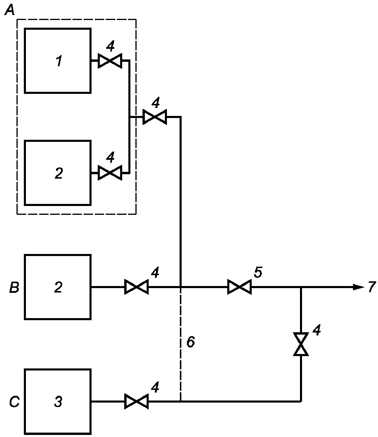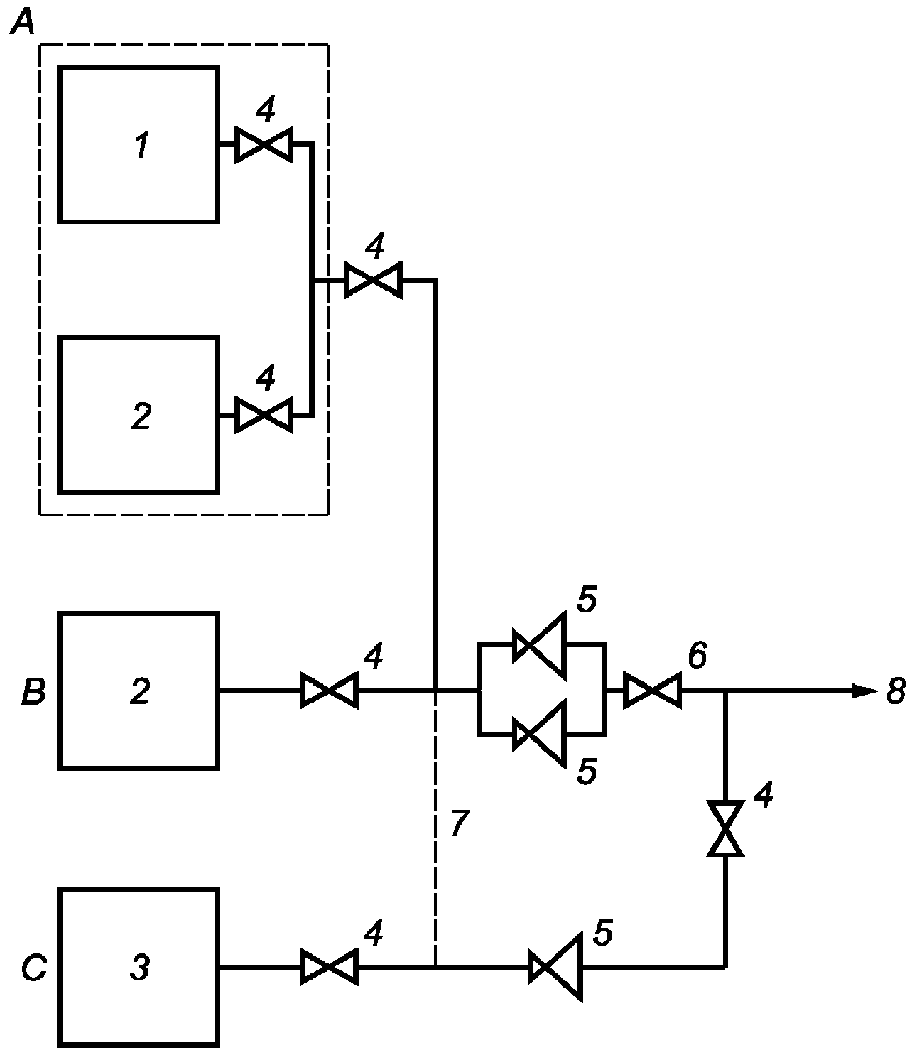3.4. двухступенчатая система подачи (double-stage pipeline distribution system): Трубопроводная система, в которой давление газа снижается редукторами от давления в баллонах до промежуточного давления, а затем от него - до номинального выходного давления.