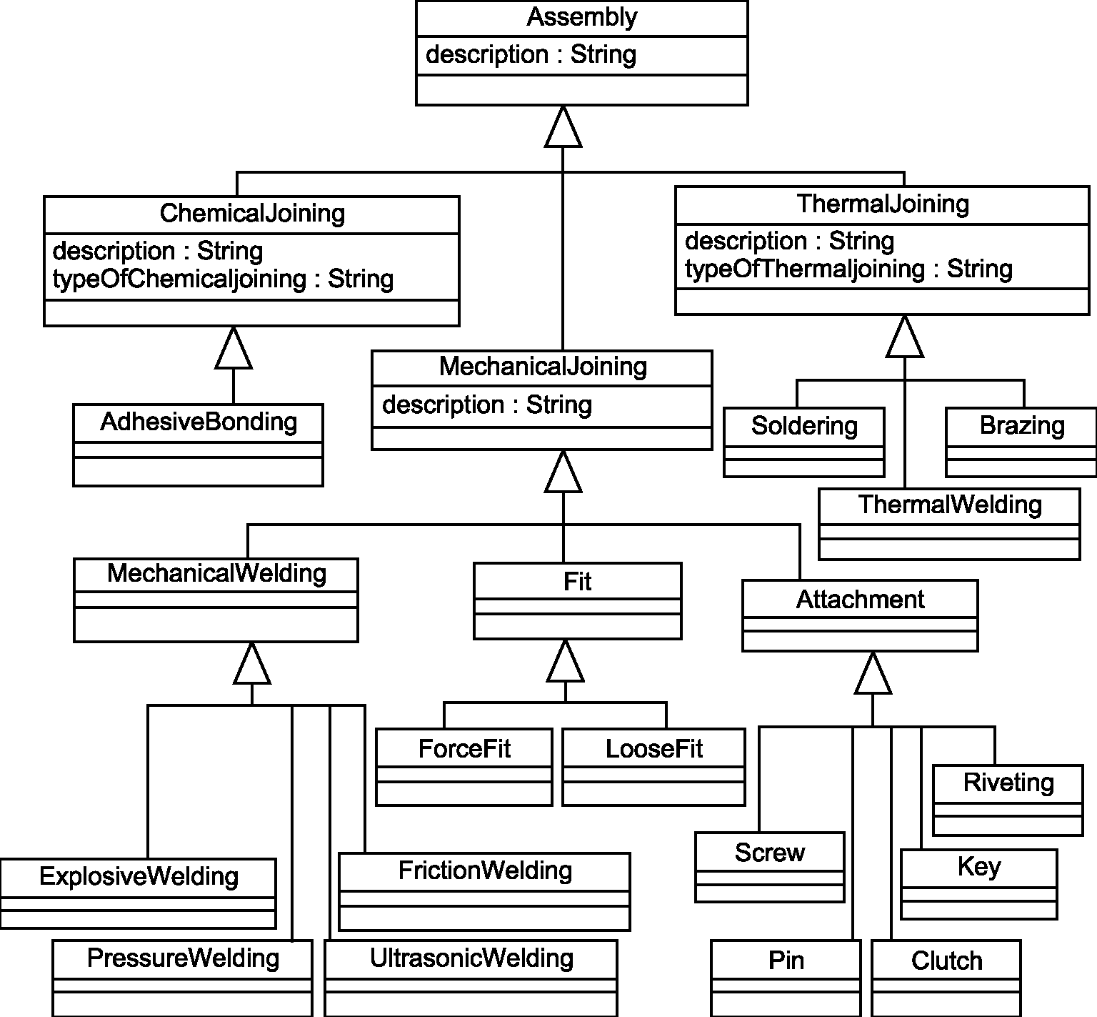 рисунок B.13) является классом, который представляет собой действие по сборке компонентов в изделие. Производными классами являются MechanicalJoining (механическое соединение), ThermalJoining (термическое соединение) и ChemicalJoining (химическое соединение). ChemicalJoining является классом, который представляет собой действие по соединению компонентов с использованием химических методов, например адгезионного склеивания. ThermalJoining является классом, который представляет собой действие по соединению компонентов с использованием методов термической связи, например пайку твердым припоем, термическую сварку и пайку мягким припоем. MechanicalJoining является классом, который представляет собой действие по соединению компонентов с использованием механических методов, например посадку, крепление и механическую сварку. Посадка может быть свободной подгонкой двух компонентов изделия или путем приложения усилия. Крепление может быть заклепочным или с использованием замков, шпилек или винтов. Механическая сварка включает в себя сварку компонентов трением, взрывом, ультразвуком и давлением.